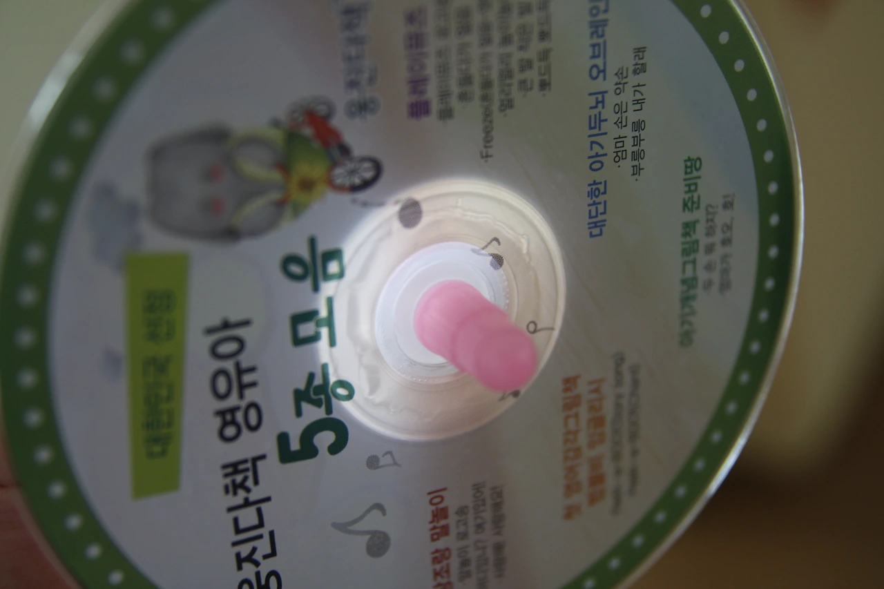 아이와 함께 유성매직으로 알록달록 색칠을 한 CD 팽이입니다.