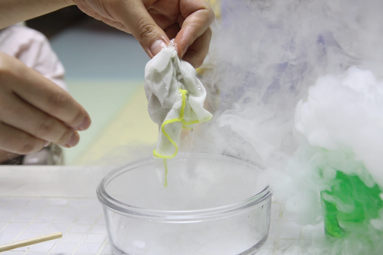 찬 물 보다는 따뜻한 물을 이용하면 드라이아이스 연기가 더욱 많이 나옵니다.