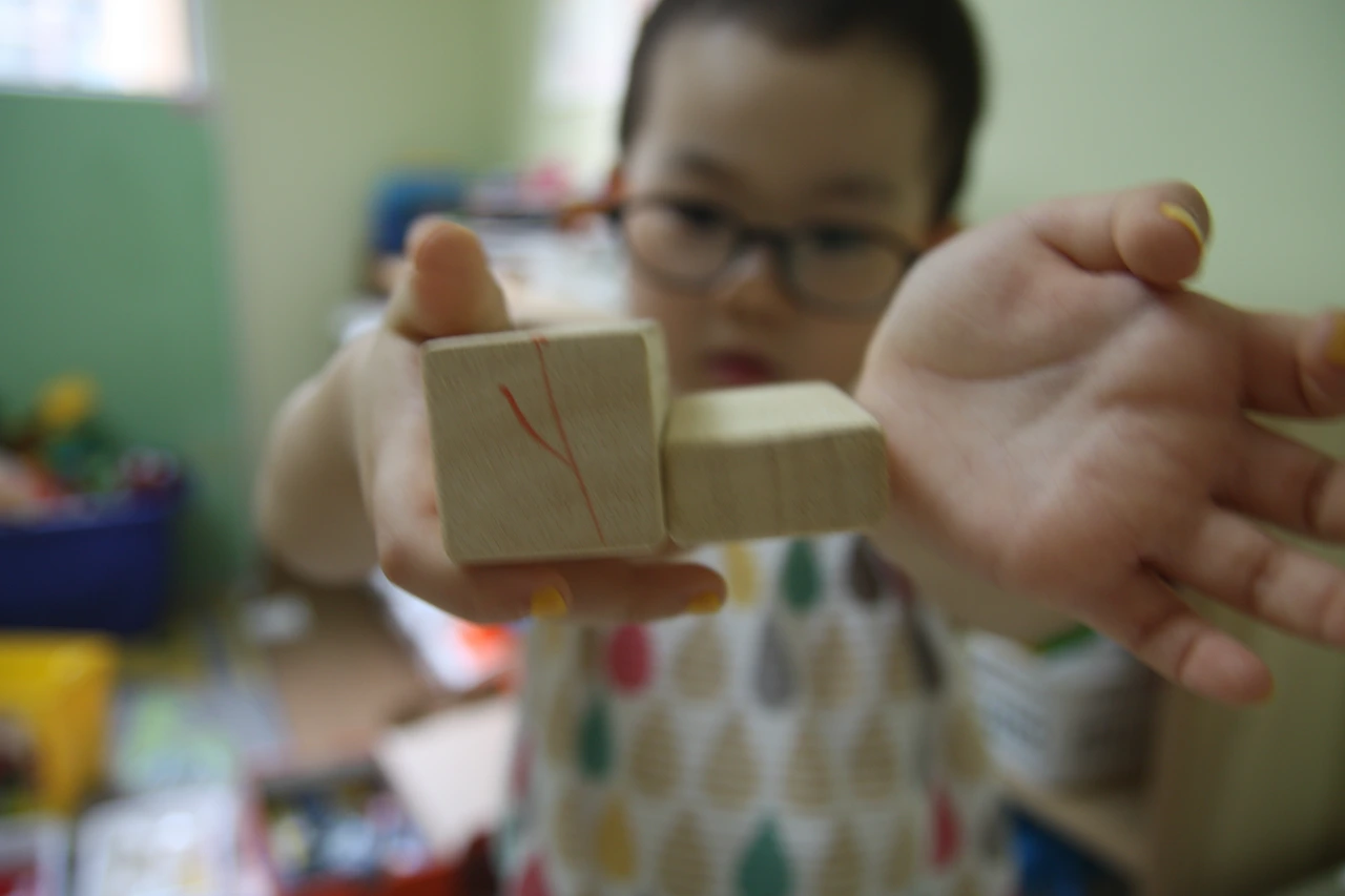 "키는 같은데 옆에서 보면 이게(왼쪽의 블록) 더 크기가 커. 그래서 더 무거운가봐."