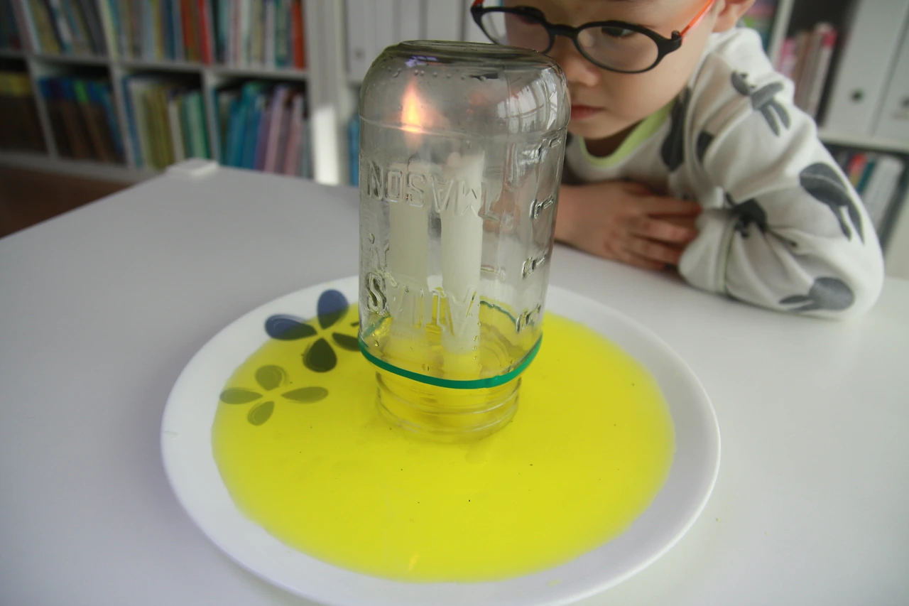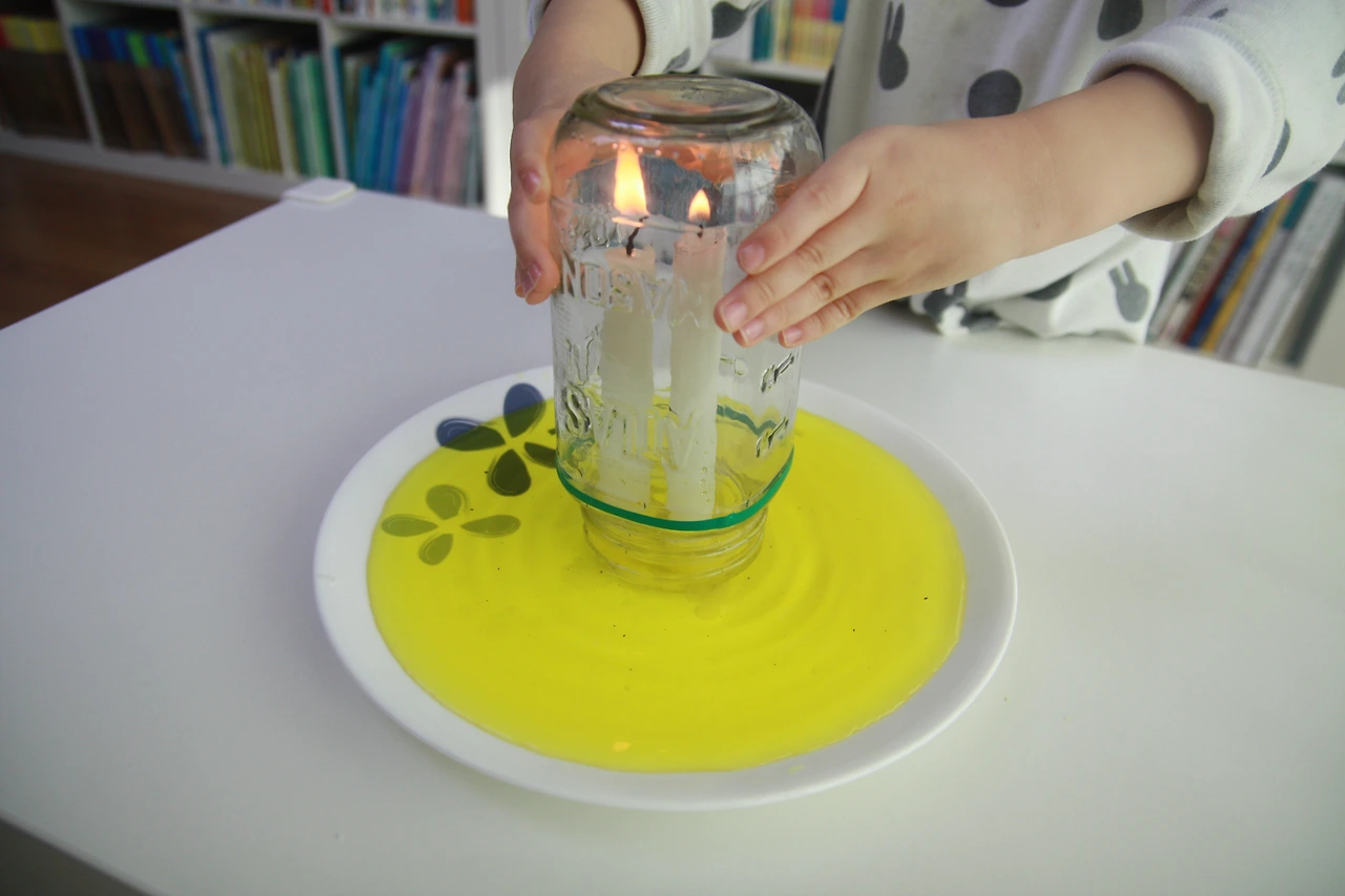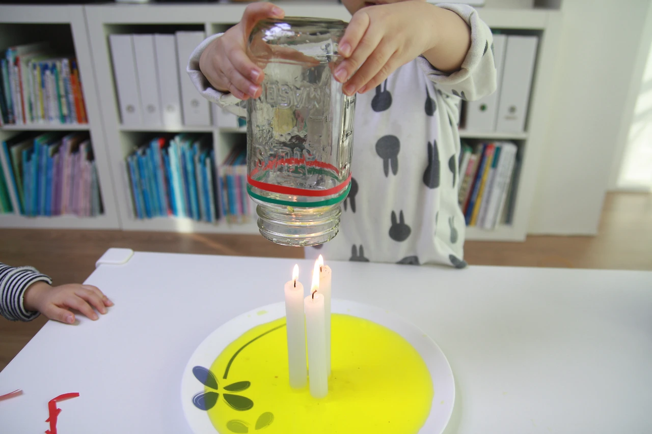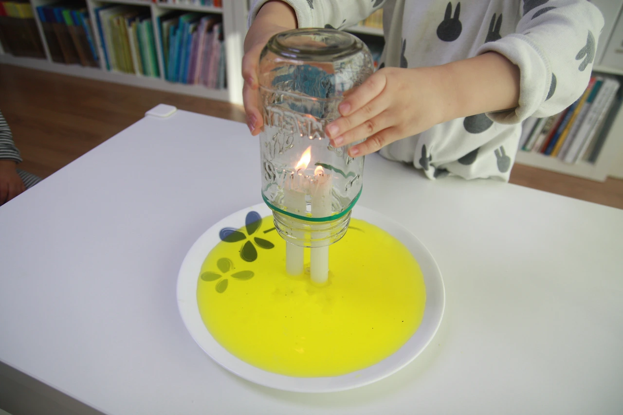 초에 불을 붙인 다음 유리병으로 덮어줍니다.