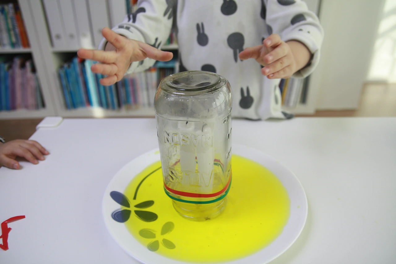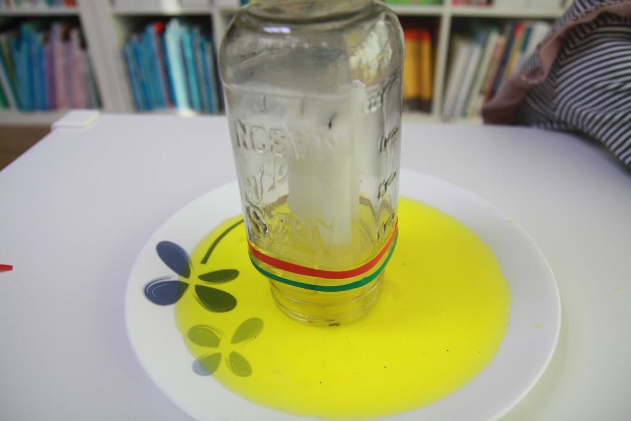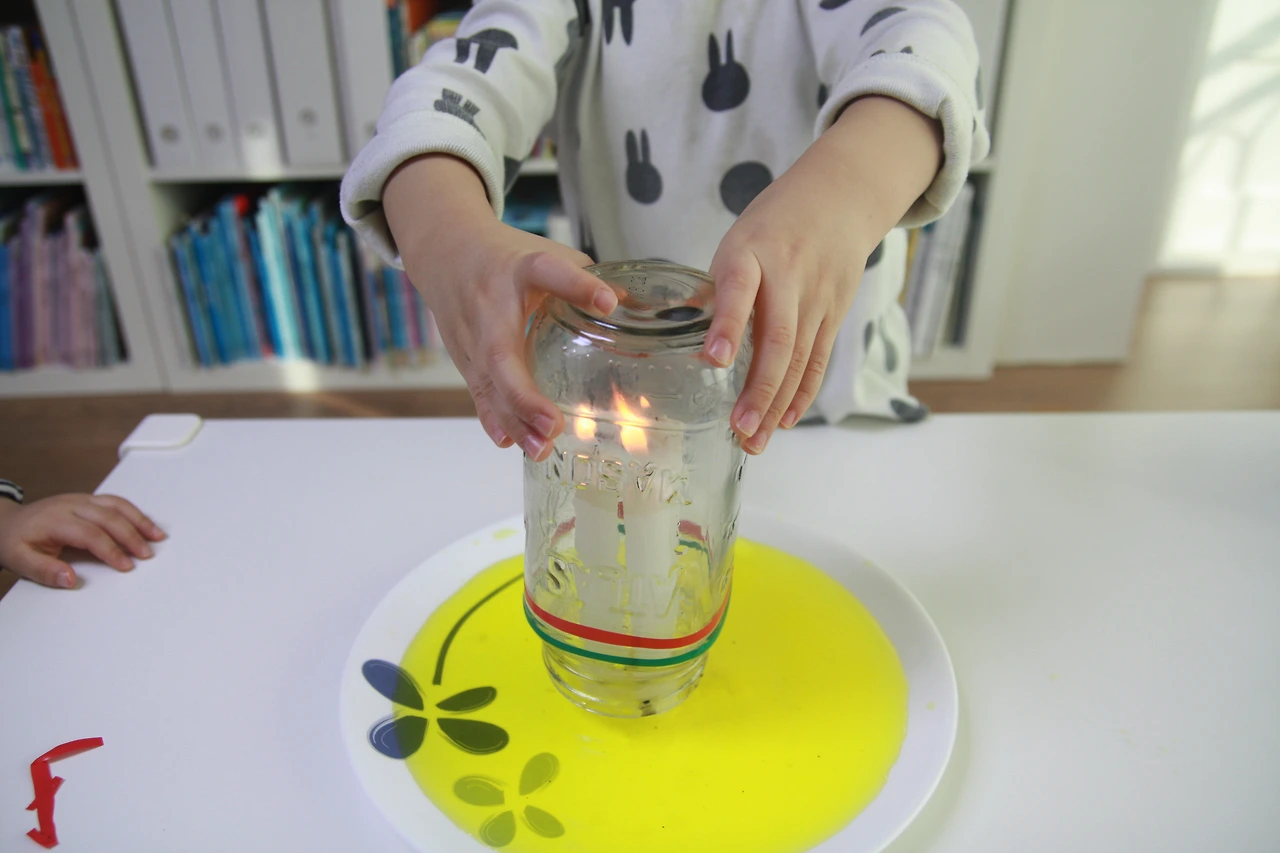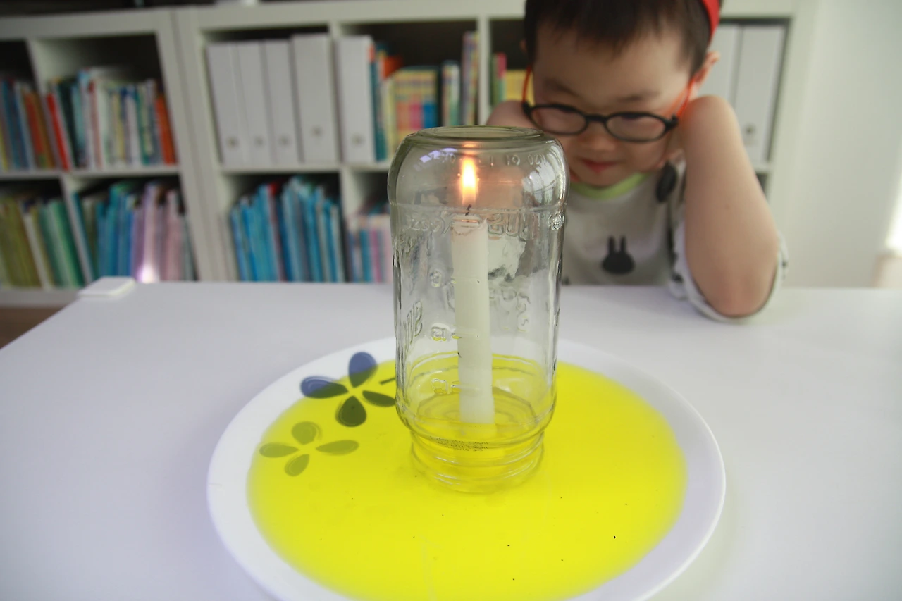 초에 불을 붙인 다음 유리병으로 덮어줍니다.