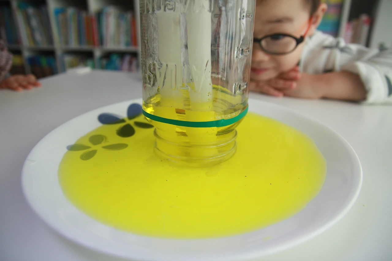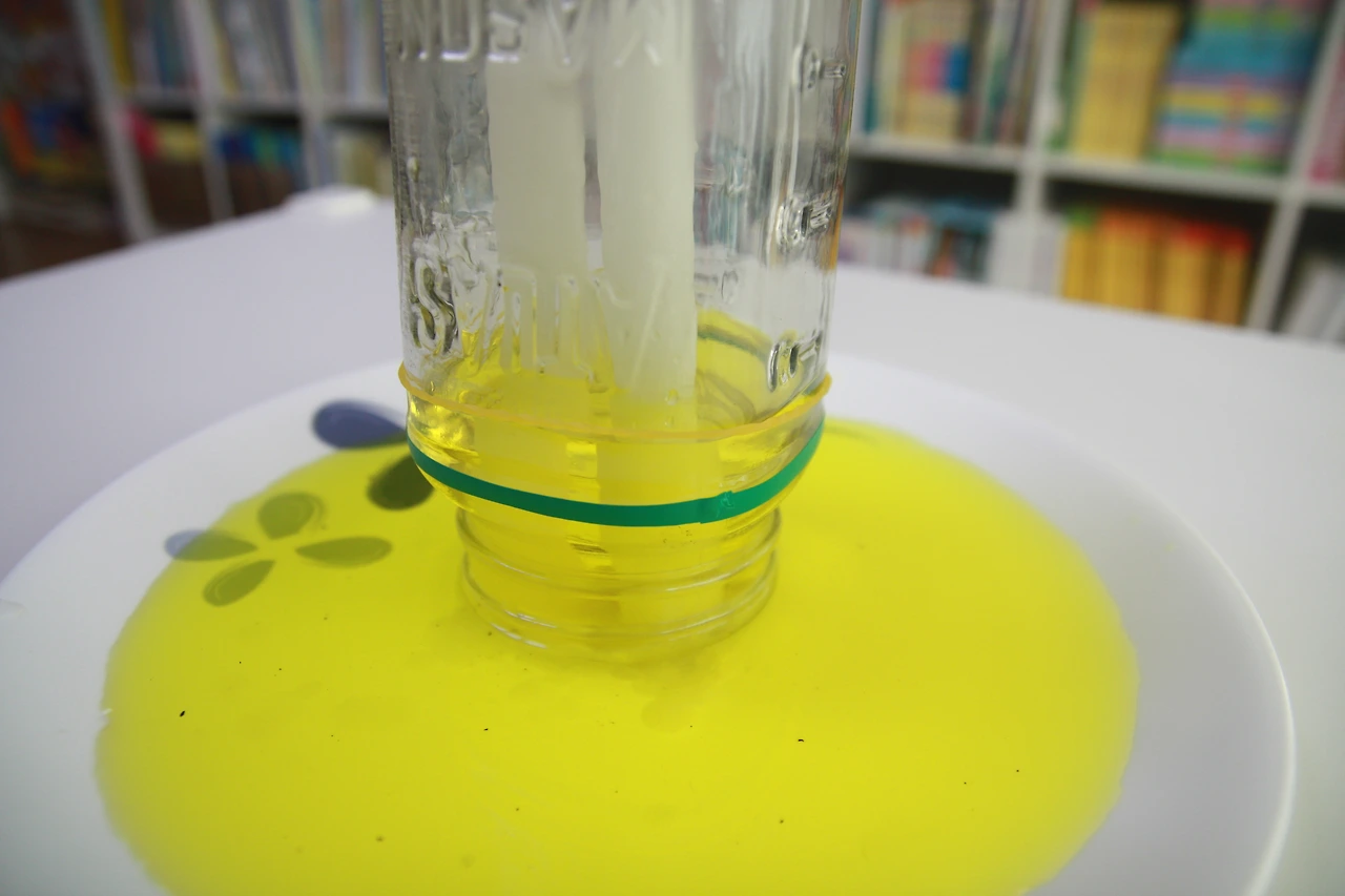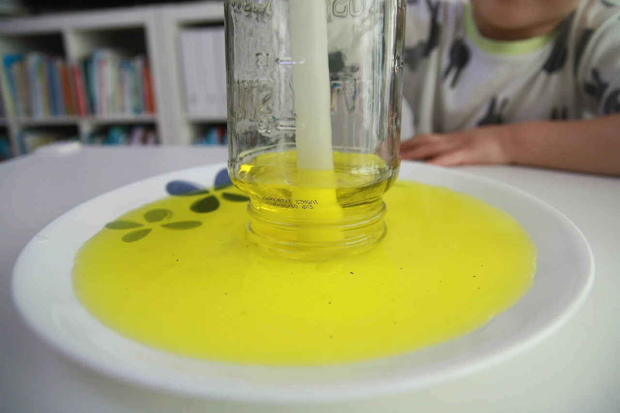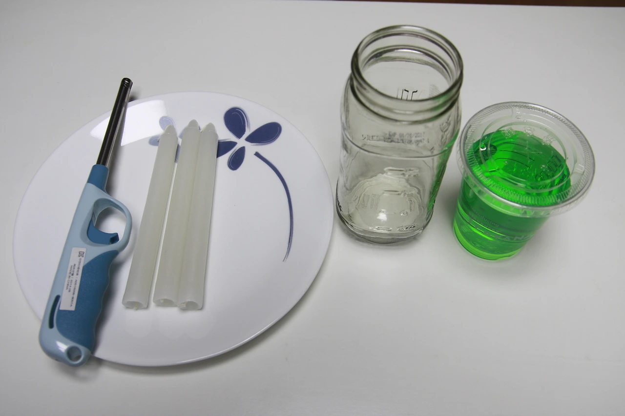 초에 불을 붙인 다음 유리병으로 덮어줍니다.