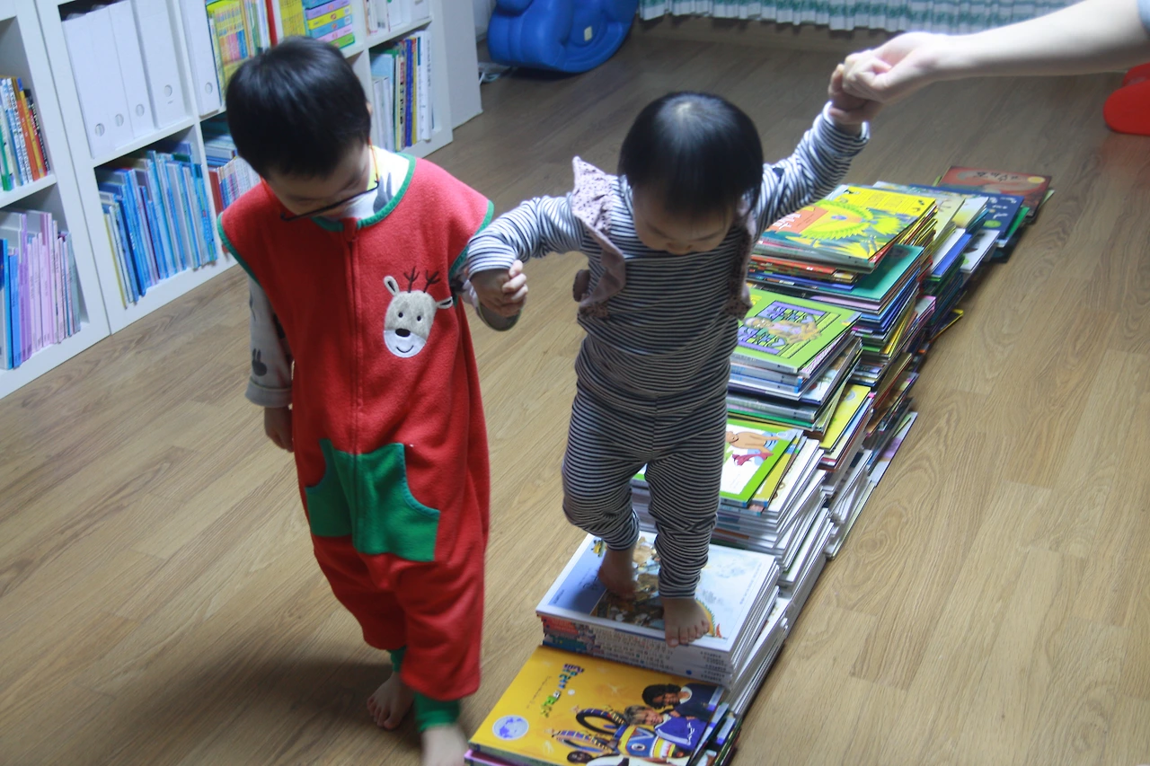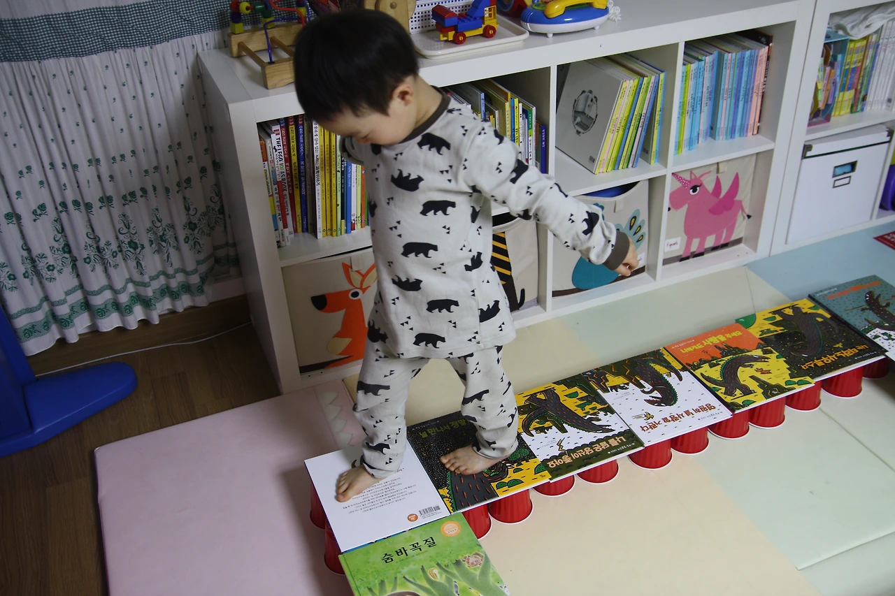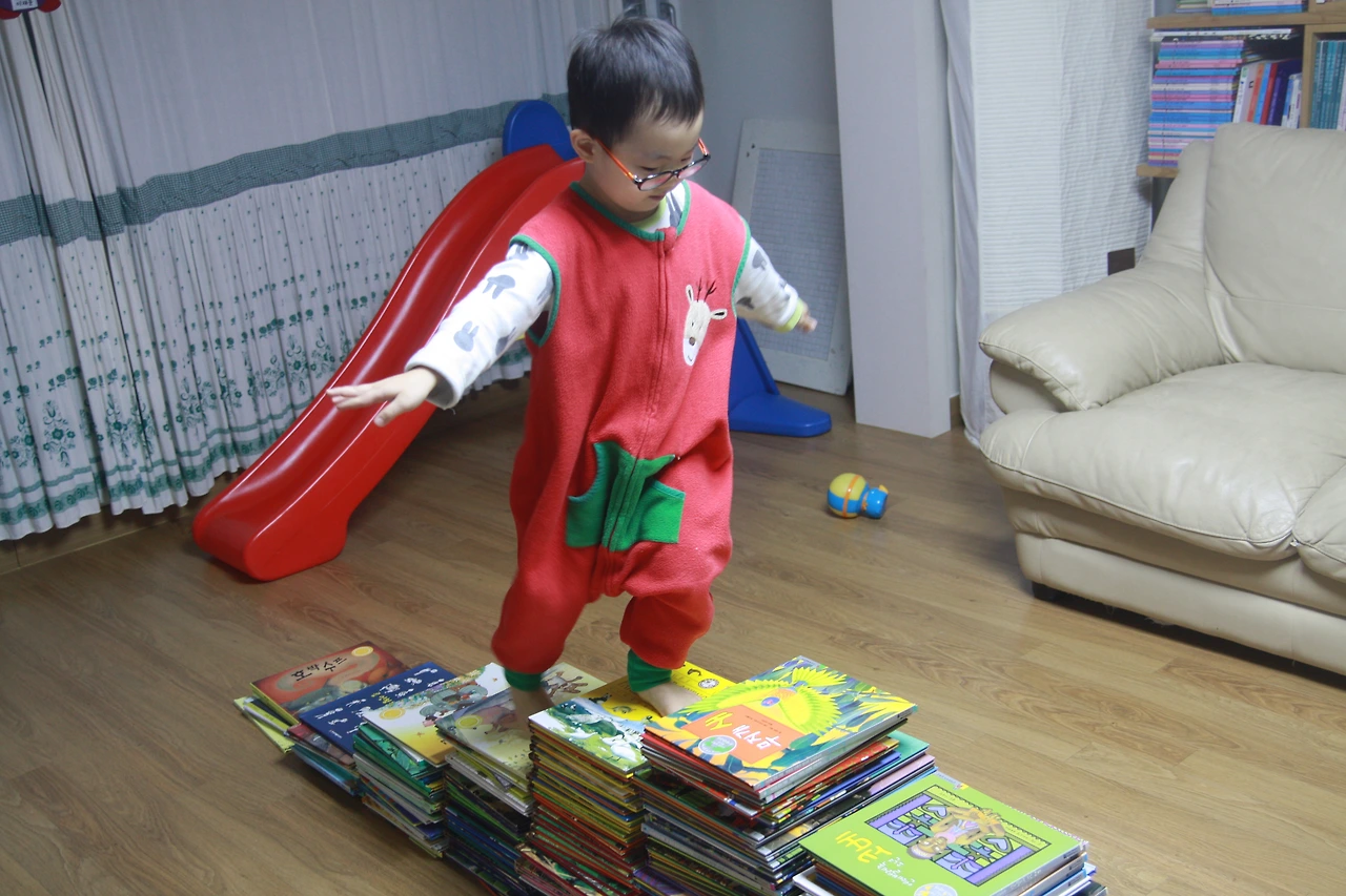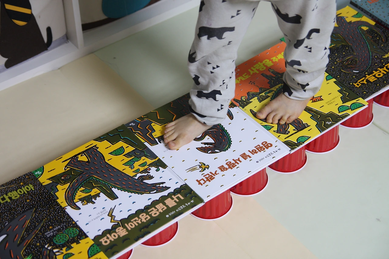 두 팔을 벌려 균형을 잡고 책 계단 올라갔다 내려갔다 해보았어요.