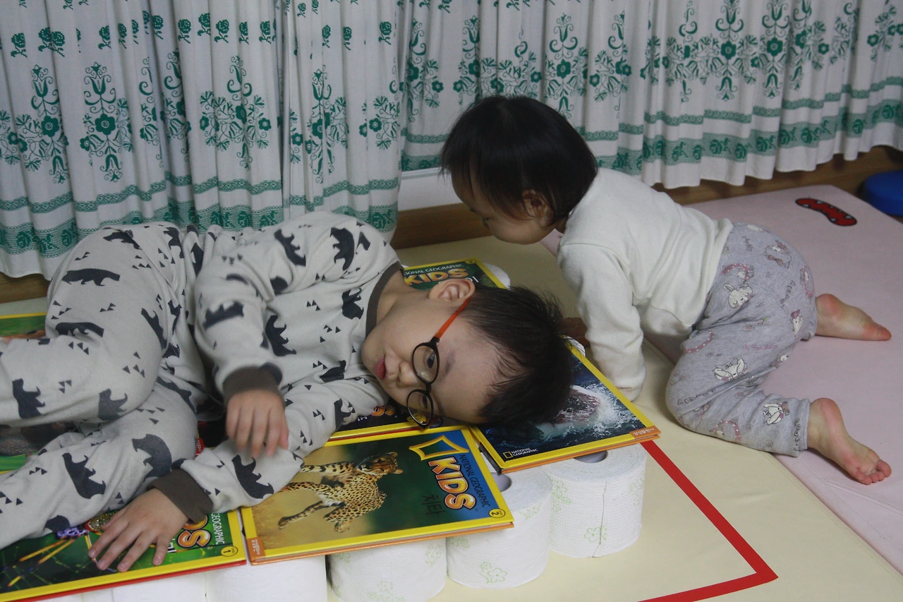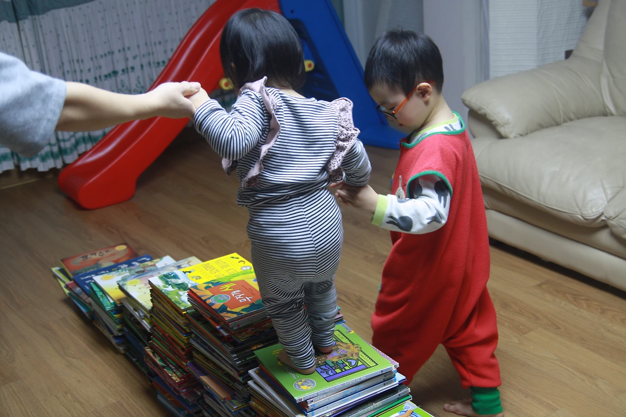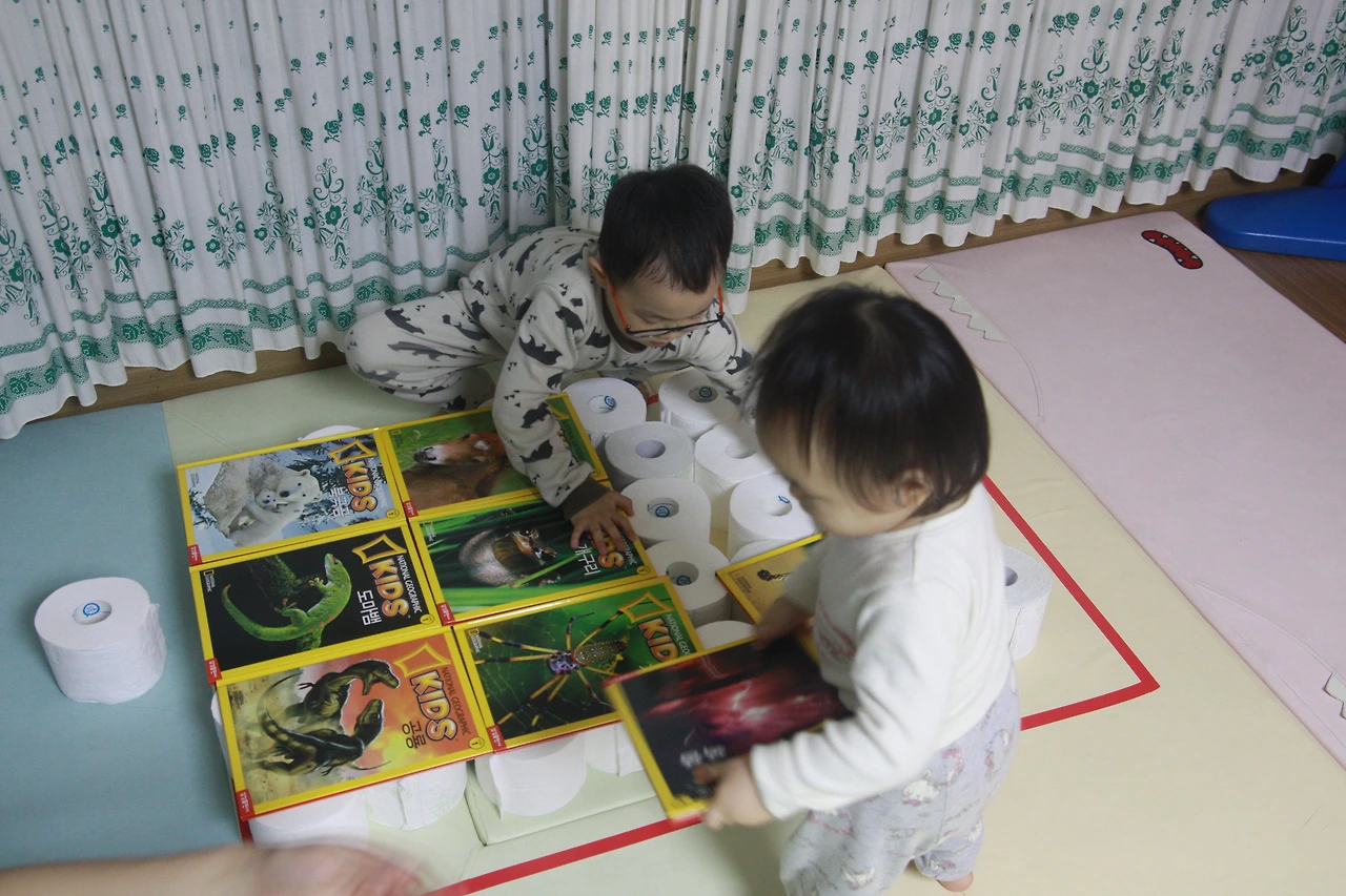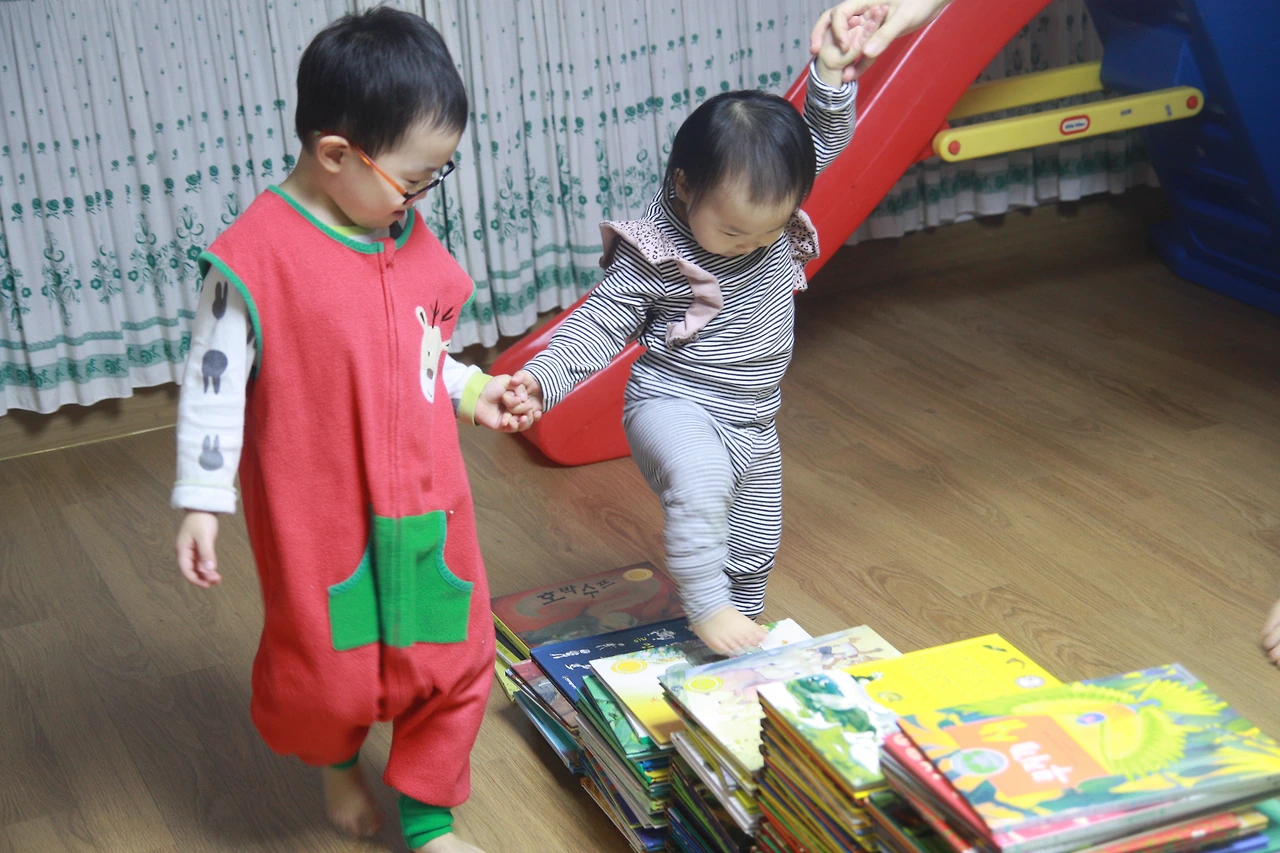 꼬꼬마가 동화책을 1권씩 들고 오빠에게 전달해주네요.