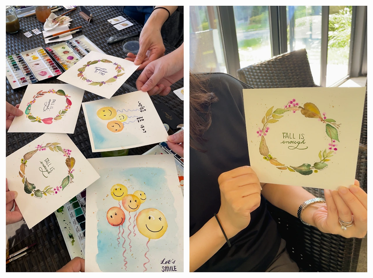 그런데 그런 작가님이 누구나 할 수 있다며 원데이 클래스를 여신다기에 바로 신청을 했다. 김연아의 점프흉내는 부상이 되겠지만, 그림하나 망친다고 하루를 망치는 건 아니니까! 너무도 기대가 되면서도 한편 내가 할 수 있을까 싶은 의심이 가득했다. 말이 '원데이'지 '2시간'인데 가능할까? 타고난 나의 정신승리력이 안되면 홍디작가님과 수다나 떨고 오자며 커져가는 의심과 걱정을 덮어주었다. 수업에 참여한 다른 분들과 잠시 이야기를 나누다가, 수업의 견본인 작가님의 작품을 본 순간 작업이 엄두가 나지 않았다. 실물로 본 홍디님의 그림은 더 예쁘고 더 정교했으며 색감도 사진으로는 충분히 담기지 않는 것이었다. 신청을 고민하던 순간보다 더 막막해졌다. 홍디님의 따스한 배려에 웃음기는 사라지지 않았을지도 모르지만 나의 수다끼는 싹 사라져 버렸다.