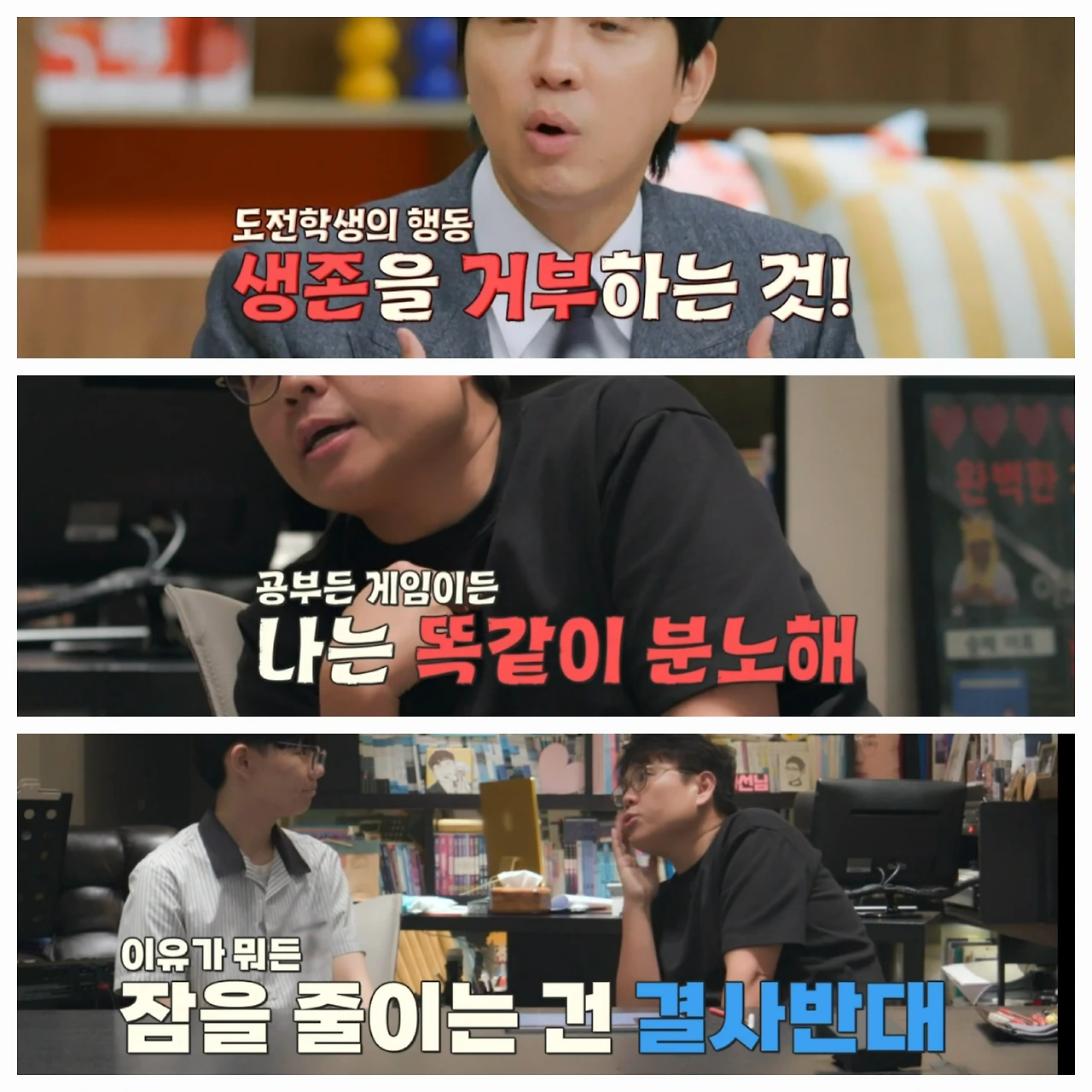문제는 잠을 일정시간 자는 게 준서 군을 위한 거라고 다들 조언해도 준서 군이 쉬이 쉬지 못한다는 거였어요. 몸이 힘들어서 쉬어도, 몸이 쉬면 마음이 더 힘들다는 준서군. 이 정도면 '성실'을 넘어 성실에 대한 '강박'이 아닐까 싶습니다. 영상 중에도 심리상담센터에 방문해서 진단을 받았는데 스트레스 정도가 매우 심각했습니다.공부보다 훨씬 앞에 건강이 있다는 것을 하루빨리 준서 군이 깨달았으면 좋겠다는 생각을 하는 중에 정승제샘이 금쪽같은 한마디를 해주셨습니다. "공부를 하다가 링거를 맞는 일이 있고, 종일 게임을 하다가 링거를 맞는 일이 있지. 나는 똑같이 분노해. 맑은 정신으로 공부를 하면 90% 받아들일 수 있는 것도 그 상태로 공부하면 50%도 못 받아들여." 선생님 말씀대로 밤새 게임을 해서 못자는 것과 공부를 하느라 못자는 것 둘다 스스로를 학대하는 일인 것은 분명하지요.