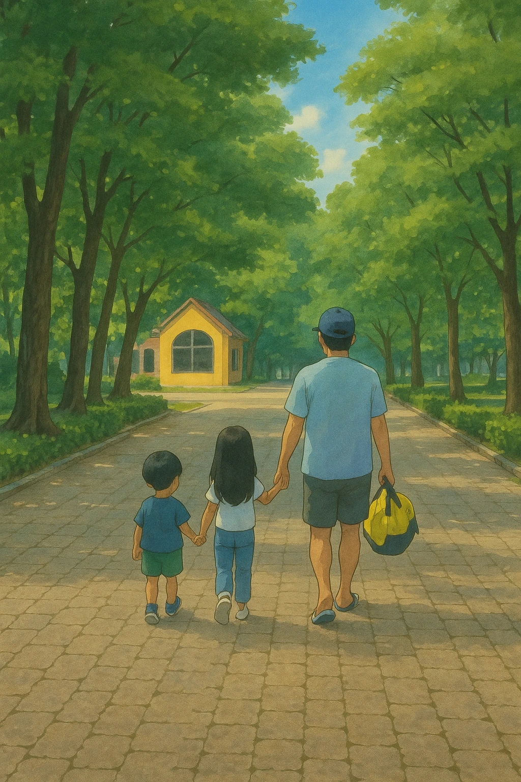 그 사진은 어린 남매와 손을 잡고 가는 젊은 아빠의 뒷모습이었다.