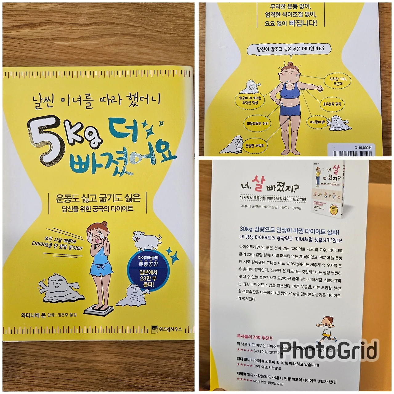 자주 도움을 받고, 가끔은 이론에만 빠삭해지지만 다이어트도 도서관부터 가본다. 성공을 비는 마음으로 도서관에서 다이어트 책을 검색하고 그중 몇 권을 대여해 왔다. 그렇게 만난 책중 한 권이 "날씬 미녀를 따라 했더니 5kg 더 빠졌어요."였다. 얇은 만화책이었고 30kg를 감량한 전편이 있었는데 집 앞 도서관엔 없었다. 뭔가 세트로 봐야 할 듯한 마음에 다른 도서관에서 "너 살 빠졌지?"를 상호대차를 신청해 세트를 섭렵했다.