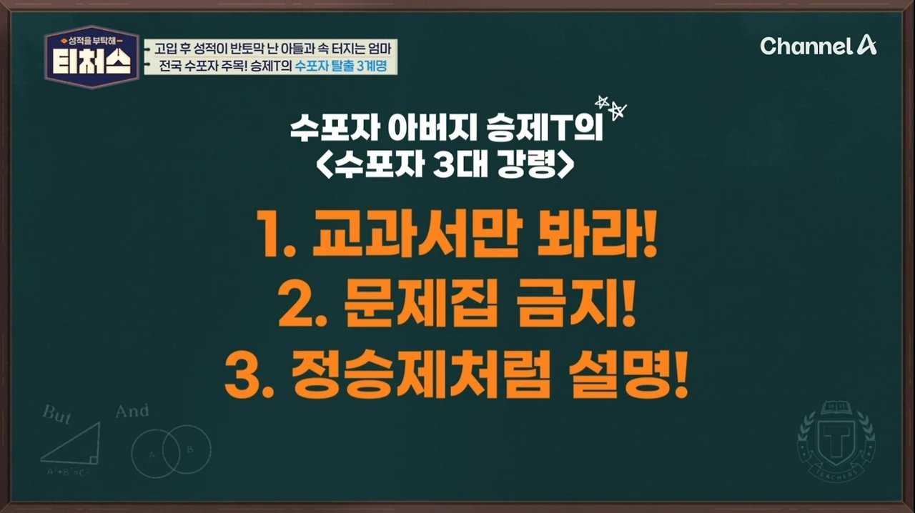 그간 영재발굴단에 준하는 상위권 친구들이 받았던 솔루션보다 이번 솔루션이 훨씬 많은 수의 학생들에게 실질적인 도움이 될 듯합니다. 일반고에서 4등급 이하인 대다수의 학생들 대부분은 가장 쉬운 교재인 교과서도 제대로 풀지 못한다는 점을 지적하시면서 다른 교재들을 다 내려놓고 교과서 정복부터 권하시는데요. 기본 없이는 응용도 심화도 불가능한 만큼 바른 방법이자 빠른 방법이라 생각됩니다. 구체적 방법이 궁금하신 분들은 티처스 29회를 꼼꼼히 시청해 보시길 바랍니다.
