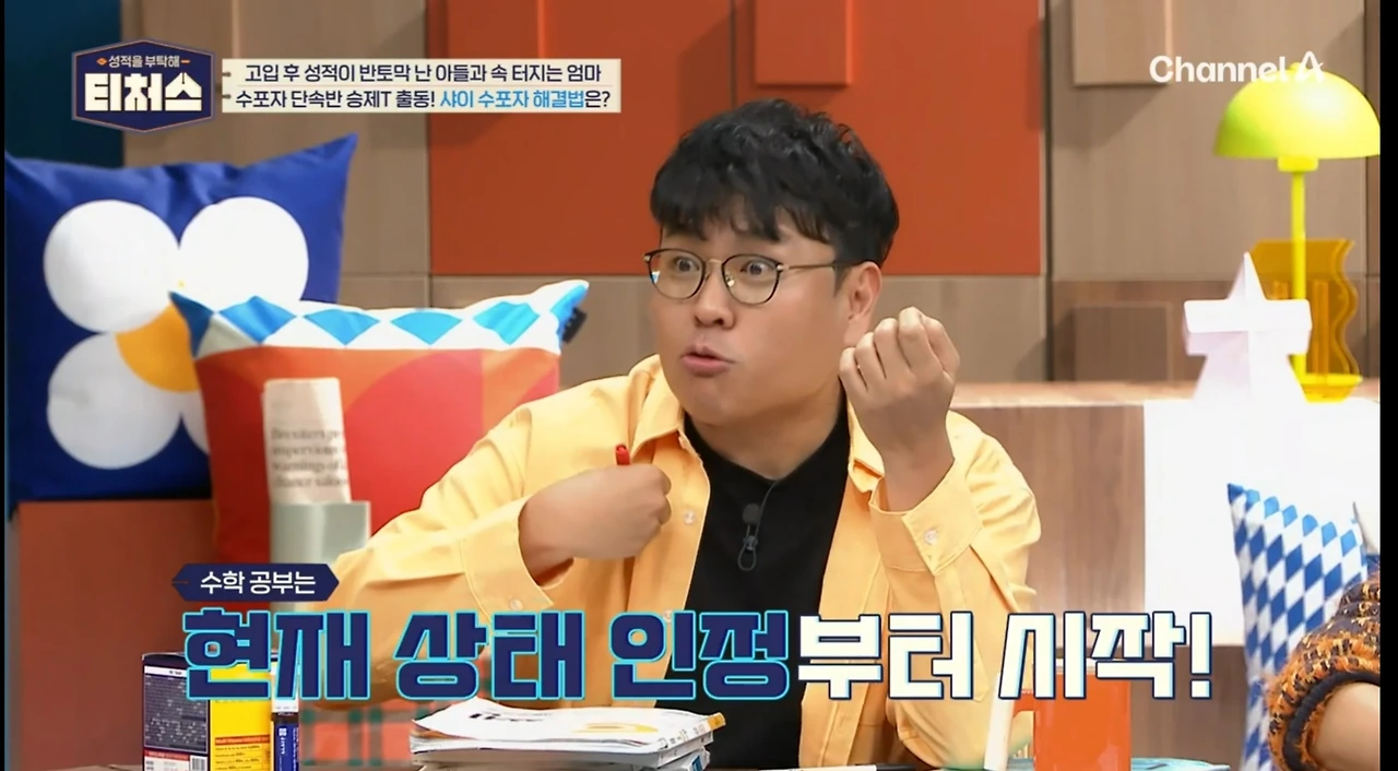 중학교까지는 상위권의 성적을 유지했던 도전학생인데 고등학교에 가서 성적이 추락하고(영어를 제외한 주요 과목이 100점 만점에 20점에서 40점대로 5~6등급대) 엄마와 사이가 급격히 안 좋아졌다고 합니다. 엄마와 언성을 높이다가 가출을 하기도 하고 한 달간 엄마와 서로 말도 안 했다가 티처스 출연이 확정되고 그걸 계기로 엄마와 다시 이야기를 시작했다고 합니다.