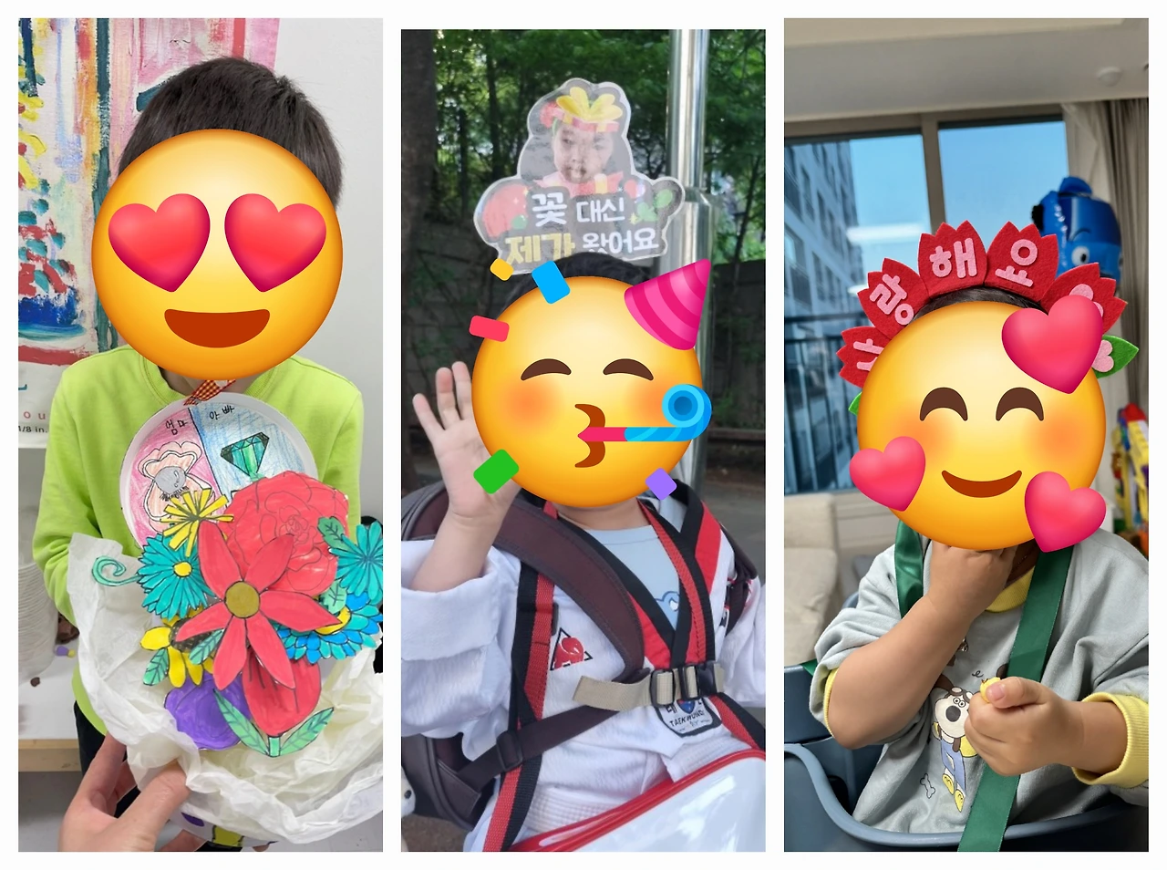 남의 글을 볼 때는' 어린이집부터 초등학교까지 약 10년을 매해 세뇌시켜도 자동화가 안 되는 아이들이 있구나' 했는데 제법 다정한 내 아들도 거기에 끼어있다. 그렇지만 부모는 아이를 '당장' 변하게 하는 사람이 아니라 '결국' 변하게 하는 사람이라고 하지 않았던가. 아들과 나가서 같이 꽃을 사고 집 앞 슈퍼에 가서 엄마아빠 안주거리를 사달라고 했다. 집에 와서 아들 손바닥의 반만 한 편지지를 주며 편지도 쓰게 했다. 이미 익숙한 엎드려 절 받기다.
