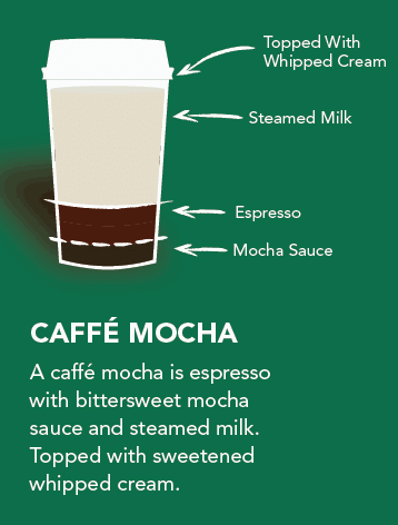 카페 모카를 주문하면 만날 수 있는 이 베리에이션 커피 음료는 잔에 초콜릿 시럽이나 초코 소스를 담고, 추출된 에스프레소를 붓고 잘 섞은 후 거품을 낸 우유를 붓고, 취향에 따라 밀크폼이나 휘핑크림을 올려준 후 초콜릿 소스나 파우더로 드리즐하여 무늬를 내어 장식합니다