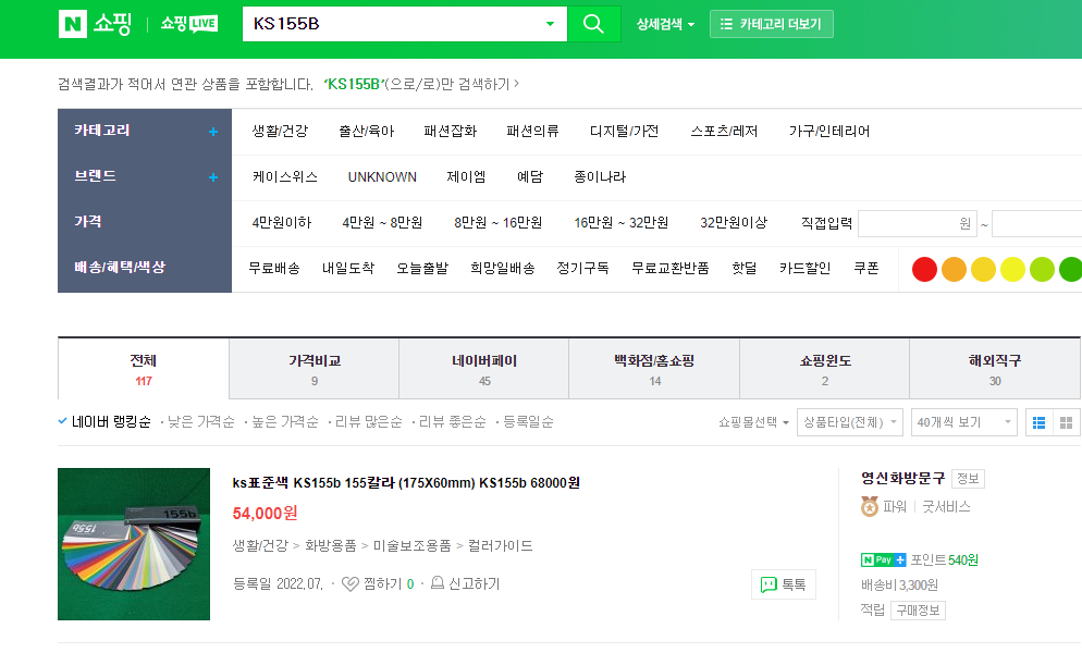 2022.08.05 가격표 (54,000원. 판매처는 한 곳 뿐이다. 쿠팡에서는 최소가가 61,200원이다. 계속 가격 올리는 중인가보다. (*2022.08.05.에 컬러칩 가격이 확 뛰고 있다. 2012년도에 37,000원에 컬러칩을 판매하던 곳에 가서 가격확인을 해보니 68,000원에 팔고 있었다.....)