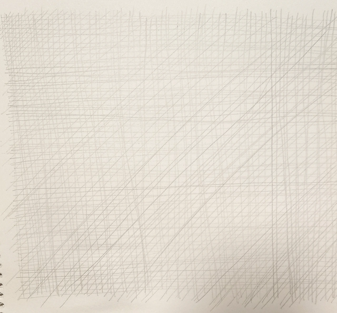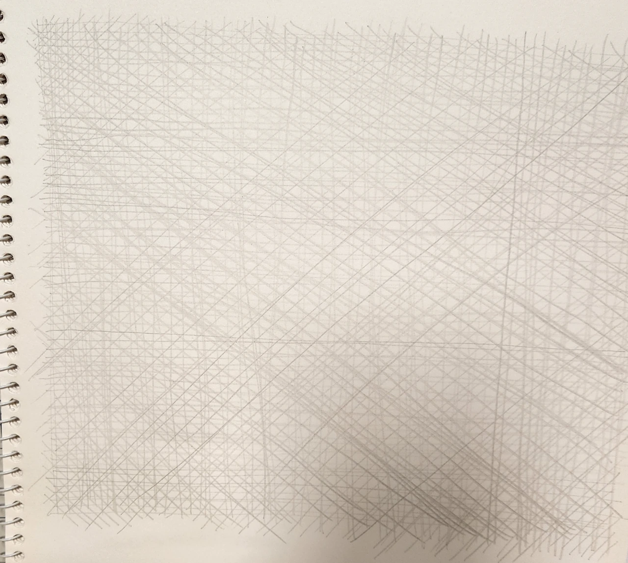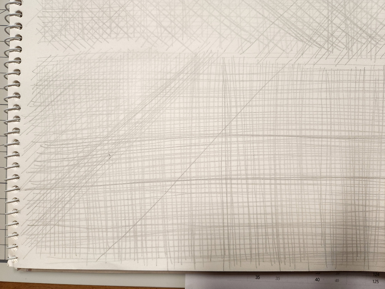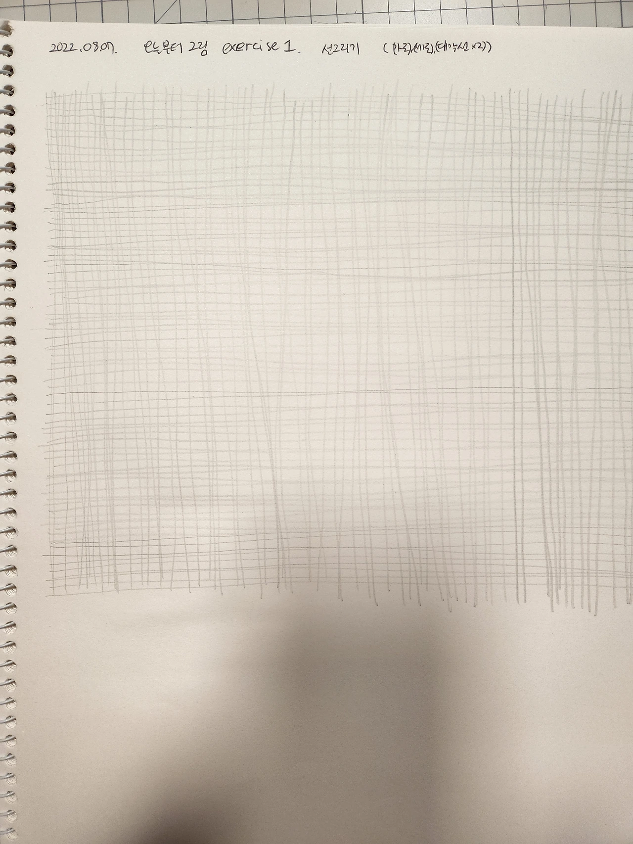 그리다가 한쪽으로 치우치는 것 같은 느낌이 들면 멀리에 최대한 똑바로 줄을 긋는 것이다. 그걸 기준으로 올라가며 선을 그린다. 선도 오른쪽에서 왼쪽으로 그었다면 이젠 왼쪽에서 오른쪽으로 긋는다. 선을 그리는 첫 순간에는 똑바로 그리게 되는 편이기 때문에 선을 시작하는 방향을 바꿔주면 조금 더 균형이 잡히는 느낌이다. (사실 며칠 하면 익숙해져서 이런 활동을 할 필요도 없어진다.)