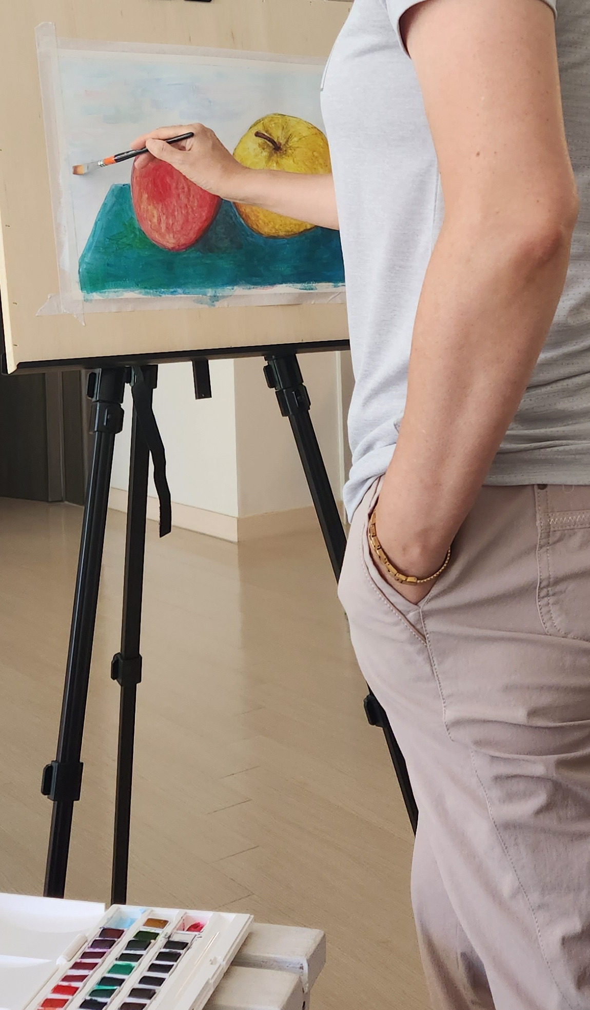 채색하다보니 주머니에 손이 자연스럽게 들어간 우리 엄마. 오래된 미술가 같아서 웃음이 났다.그리고 나는 동시에 수채화를 사용하는 방법을 까먹었다.