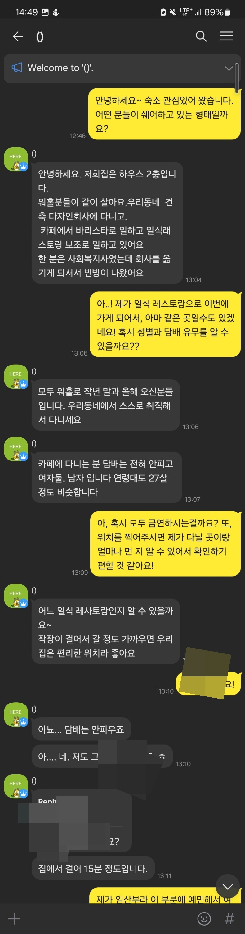 나는 임산부이기 때문에 담배냄새에 민감하다고 했다. 집 안에 담배 피는 사람이 없는지, 냄새가 나지는 않는지 3번을 확인했다. 집에는 총 7명이서 살고 있었고 (계약금을 보낼 당시에는 아주머니께서 설명을 흐지부지 하셨는데, 총 3명이서 살고 있는 줄로 이해했다.) 2명이 흡연자였다. 옆 집에서는 거의 매일 밤마다 대마초를 피우는지 냄새가 올라왔다.