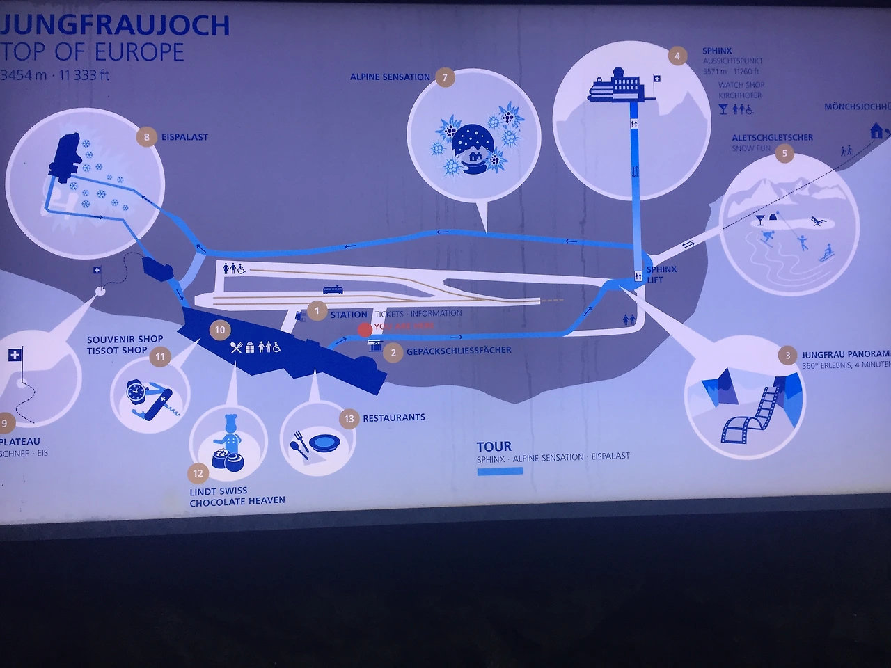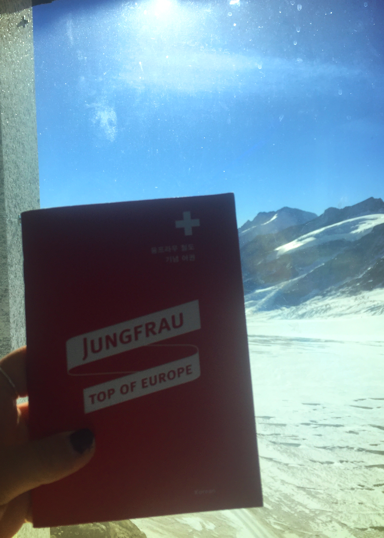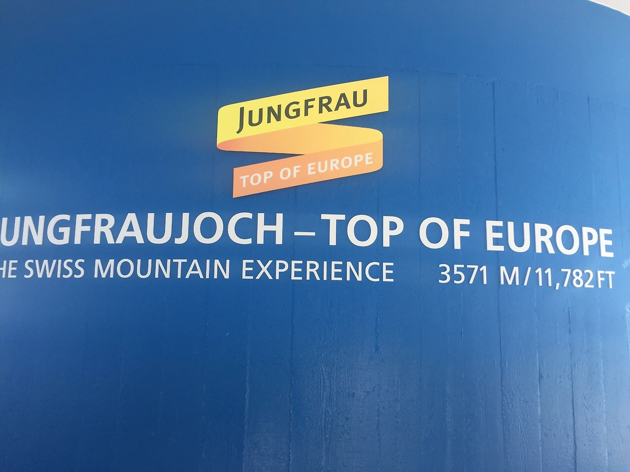 총 두 시간 반이 걸려 도착한 기차가 드디어 융프라우 역에 멈춰 선다. 기차에서 내리면 '융프라우, 유럽에서 가장 높은 곳(Jungfraujoch - Top of Europe)'이라는 거대한 파란 간판이 눈에 바로 들어온다.