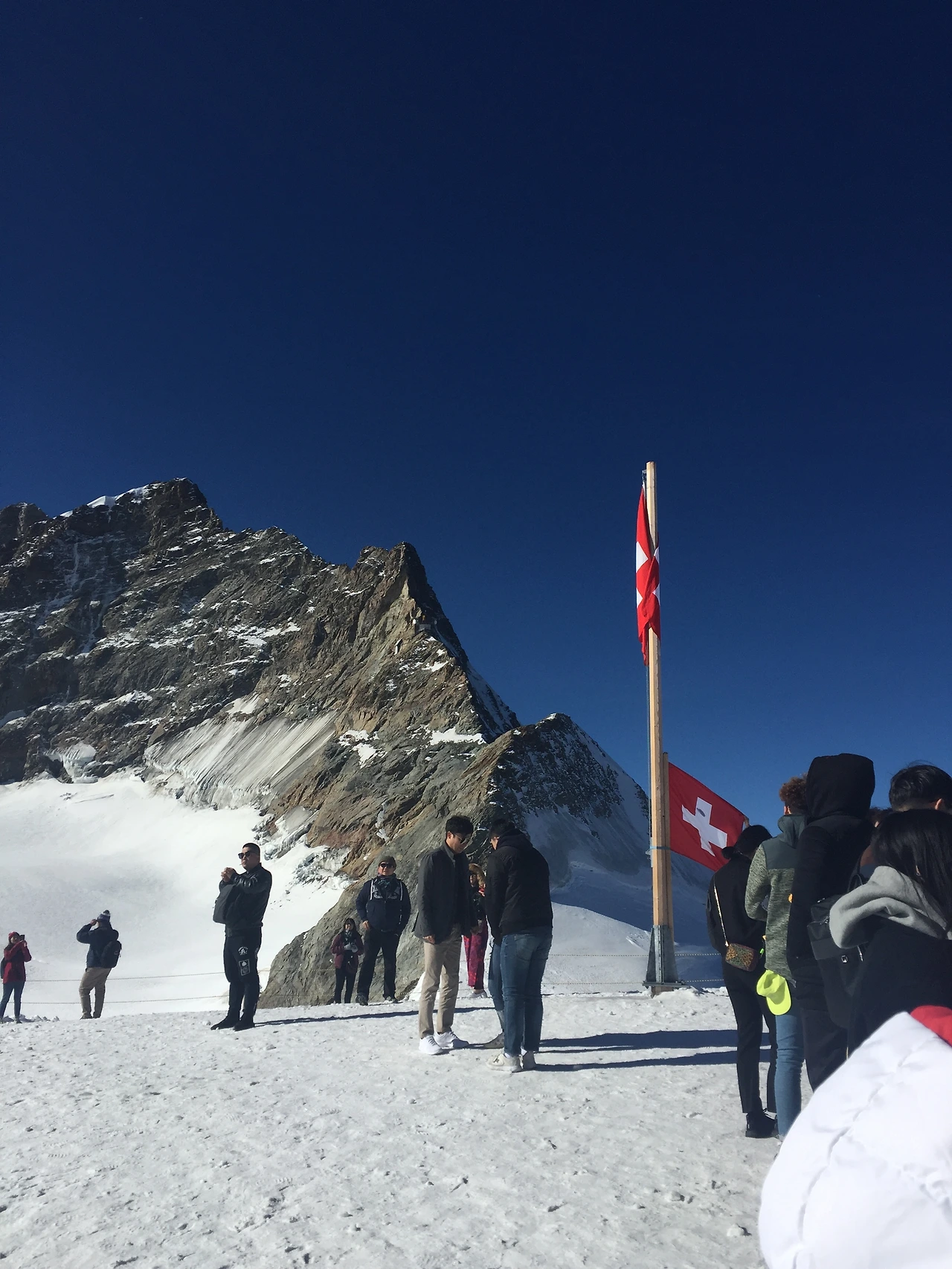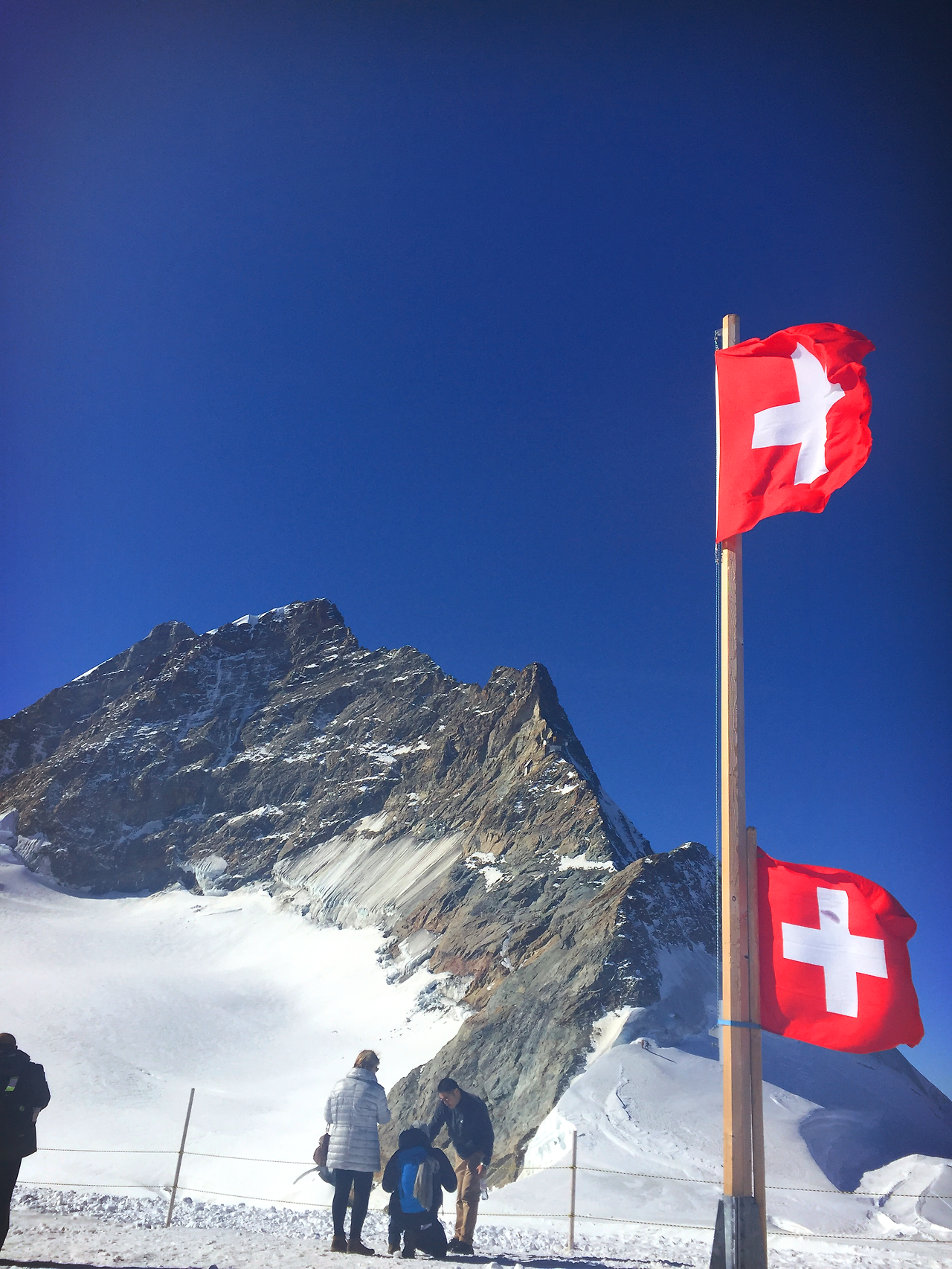 얼음 궁전을 지나면 하얀 눈 밭 위에 스위스 국기를 볼 수 있는 고원지대가 나온다. 융프라우에 와서 처음으로 눈을 밟아 보게 되는 곳이다. 왜인지 모를 조심스러운 발걸음, 새하얀 눈밭은 밟기조차 망설여진다.