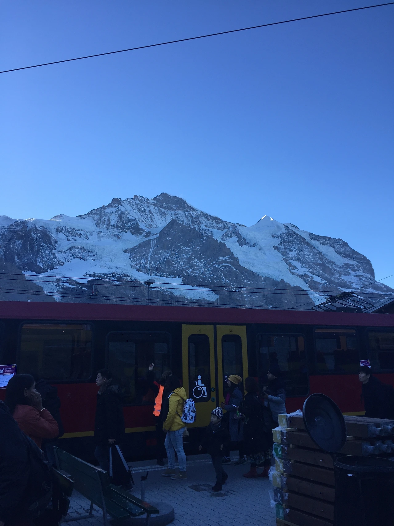 만년설의 스위스 국기가 유난히 눈에 띄는데, 그곳에서 사람들이 사진을 찍기 위해 길게 줄을 서 있는 모습이다. 영하의 기온에도 사람들은 만년설의 알프스를 가득 담으려 한다.