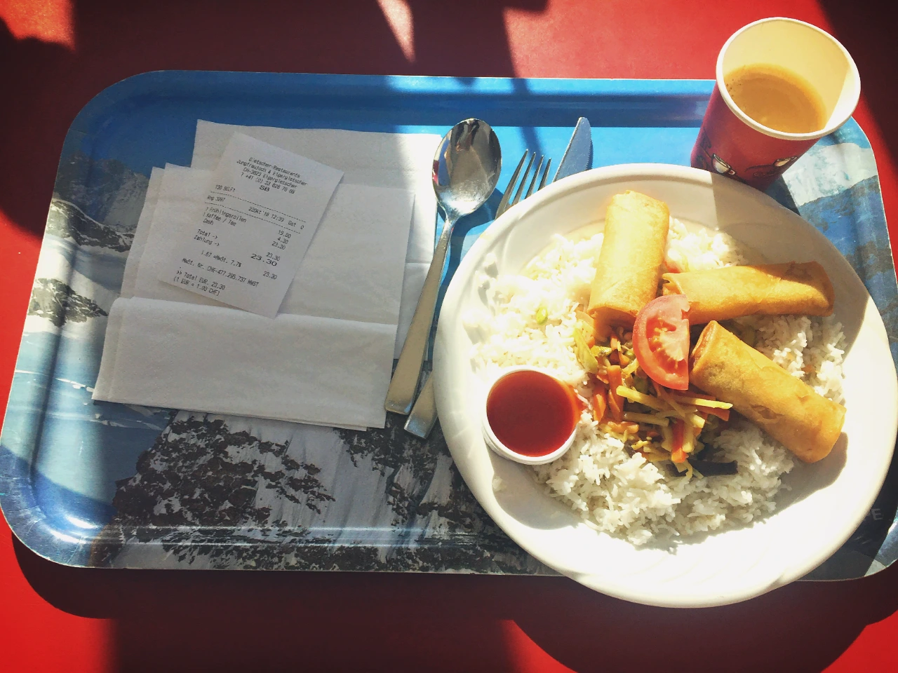 알프스 산맥이 보이는 명당에서 따듯한 음식과 함께 휴식을 가져본다. 큰 창으로 들어오는 햇살은 추위에 노출되어 있던 긴장한 몸을 녹여준다. 따뜻한 음식 한 숟가락과 한 잔의 커피로 온 알프스를 얻은 듯 마음이 풍족해진다.