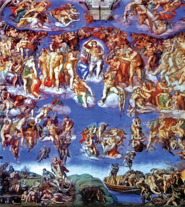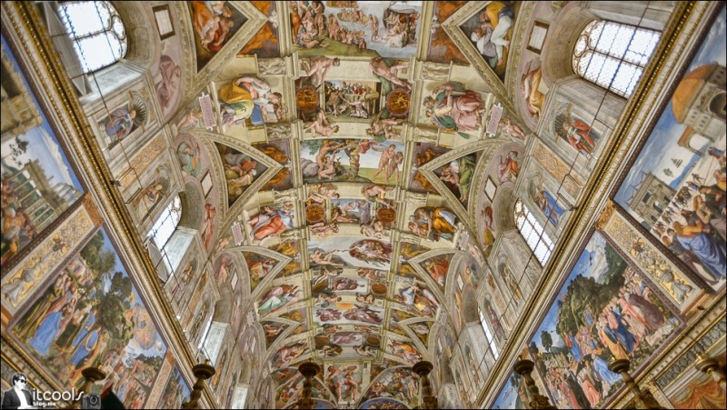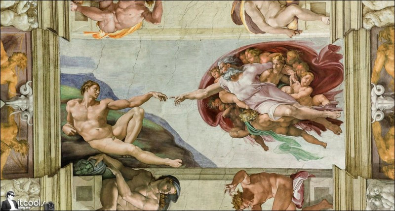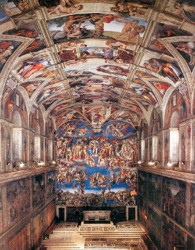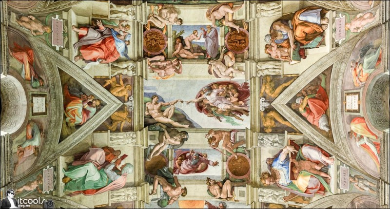 천장 중에 길게 9개 부분은 《아담의 창조》를 테마로 하여 제단에서부터 《빛의 창조》 《해·달·초목의 창조》 《땅과 물을 나누다》 《천지 창조》 《이브의 창조》 《원죄와 낙원 추방》 《노아의 번제》 《노아의 홍수》 《술 취한 노아》를 그렸다.