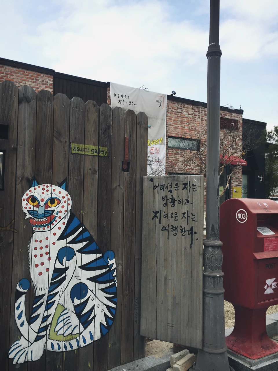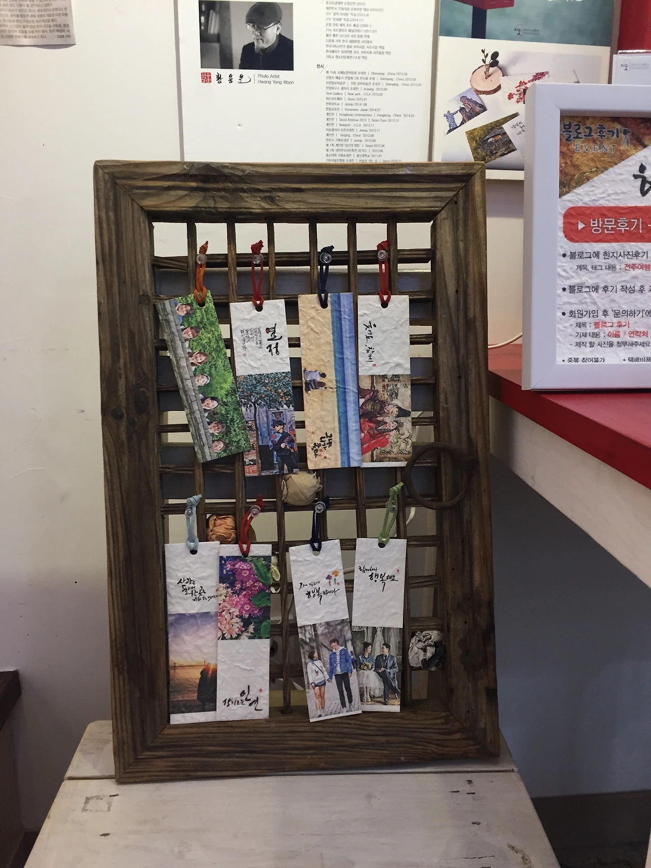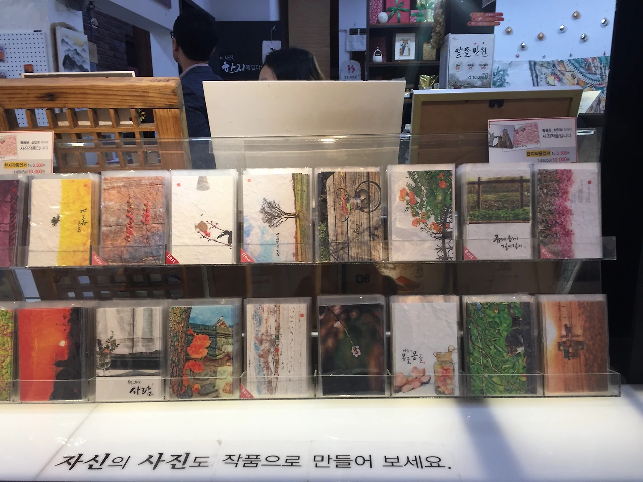 우리는 숙소에 짐을 풀고 곧바로 길을 나섰다. 길을 나서자마자 보이는 건물에는 '지숨(zi:sum)'이라는 이름의 기프트샵이 나타난다. 한지로 만든 엽서카드와 공예품들을 판매하는 이 곳에는 100여 가지의 한지로 만든 엽서카드와, 책갈피, 사진인화, 그리고 한지로 만든 각종 공예품들이 눈길을 사로잡는다. 엽서카드는 한 장에 1000원, 열두 장엔 만원으로 판매되고 있었다. 다양한 콘셉트의 엽서카드를 보면 구매욕구가 자연스레 솟는다.