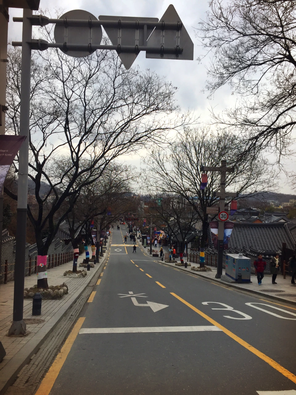 우리는 든든히 점심을 먹고, 한 바퀴 전주 한옥마을을 걸어보기로 한다. 전주 한옥마을의 입구이자 정문이 있는 곳에서 한옥마을을 내려다보면 길게 뻗은 도로 옆으로 한옥마을이 고즈막히 자리 잡고 있는 모습이다.