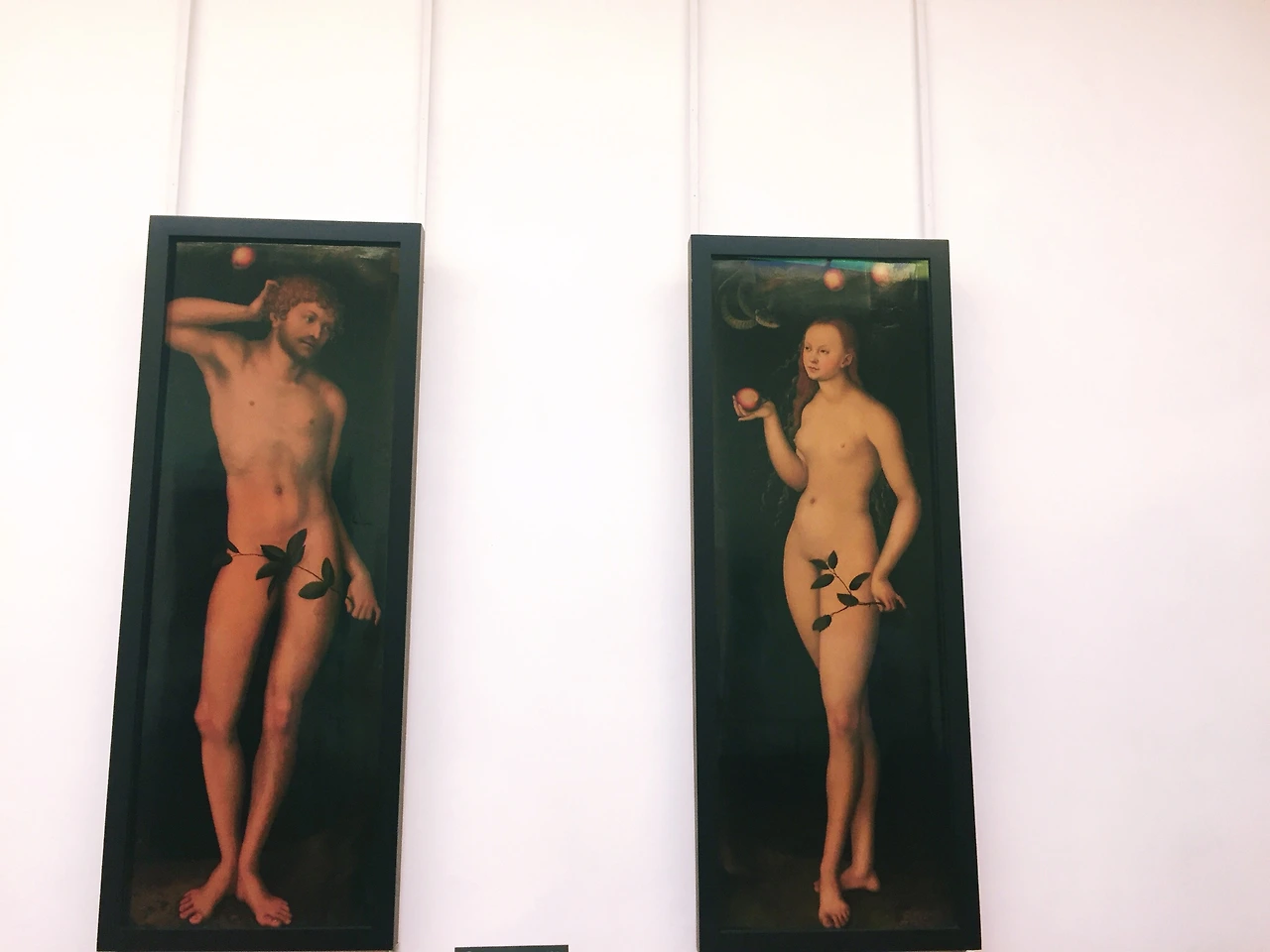 루카 크라나흐의 <아담과 이브>는 한 손으로 머리를 긁적이는 아담의 모습이 흥미롭다. 어리숙해 보이는 아담에게 사과를 건네는 이브의 모습으로부터 죄가 여성으로부터 기인된다는 작가의 해석이 강조되고 있다.