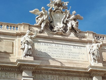건물 제일 위를 보면 라틴어로 ‘CLEMENS VII’라고 클레멘스의 이름이 적혀 있고, 그 아래에 AQVAM VIRGINEM이라고 적혀 있는데 ‘처녀의 샘 분수’라는 것을 명명하고 있다. 양쪽에 있는 4개의 여인 조각상은 4계절을 상징한다.