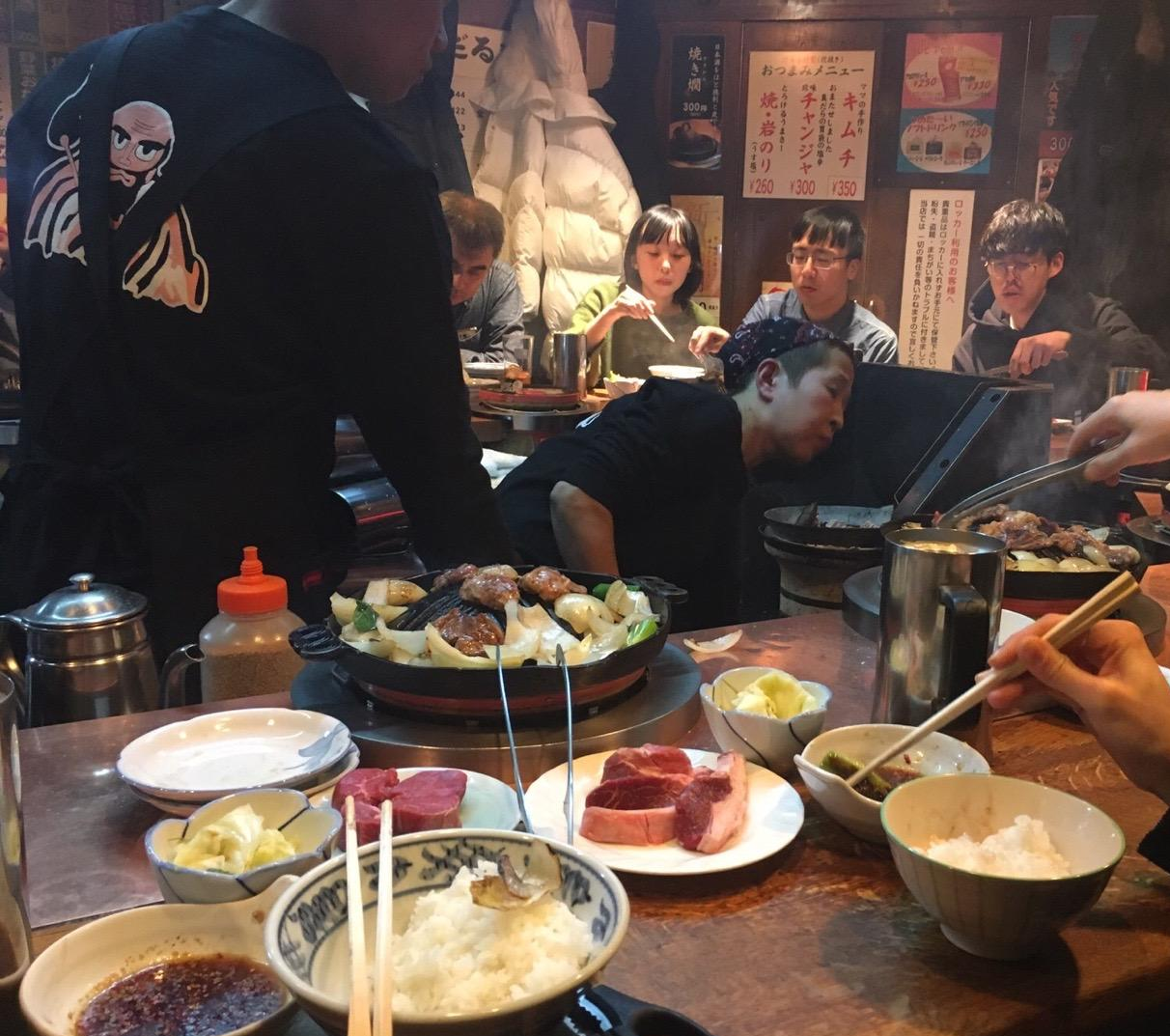 일본의 가게는 대부분 협소하고, 단체 손님이 방문하기에 적합하지 않은 터라 8명 정도로 인원을 제한하고 모임에 나갔다. 처음 만나기로 한 사람의 이름이 '수지'와 '진아'여서 괜히 설레게 만들었지만, 누구보다 건장했던 형 둘을 만나 남자 셋이서 어색하게 술을 먹기 시작했다. 낯선 남자 셋이 만나서 할 수 있는 건 며칠 동안 각자 즐겼던 삿포로 여행에 대해 이야기하는 것뿐이었다. 소재가 슬슬 고갈되갈 때쯤, 사람들이 하나 둘 오기 시작했고, 여성 친구가 들어왔을 때의 그 형들의 표정은 잊히지 않는다. 결국, 나중에는 2명 정도는 약속을 취소하고, 친구들이 게스트하우스에서 3명의 친구를 더 데려와 총 9명이 만나게 되었다.