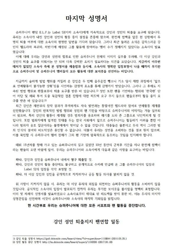 요즘은 아이돌 멤버가 되돌릴 수 없는 실수를 하면 탈퇴 요구를 하는 성명서까지 내며 집단행동을 한다. 엑소 첸이 결혼 및 혼전임신 소식을 발표하게 되었을 때, 첸의 행동에 실망한 일부 팬들은 탈퇴 요구를 진행했다. 슈퍼주니어의 경우 강인의 폭행, 음주운전 등의 실수가 누적되자 팬들이 먼저 탈퇴 요구에 나섰다. 팬덤이 강한 프로야구 역시 선수의 음주운전 등이 발각되면 팬들이 먼저 탈퇴 요구를 한다.