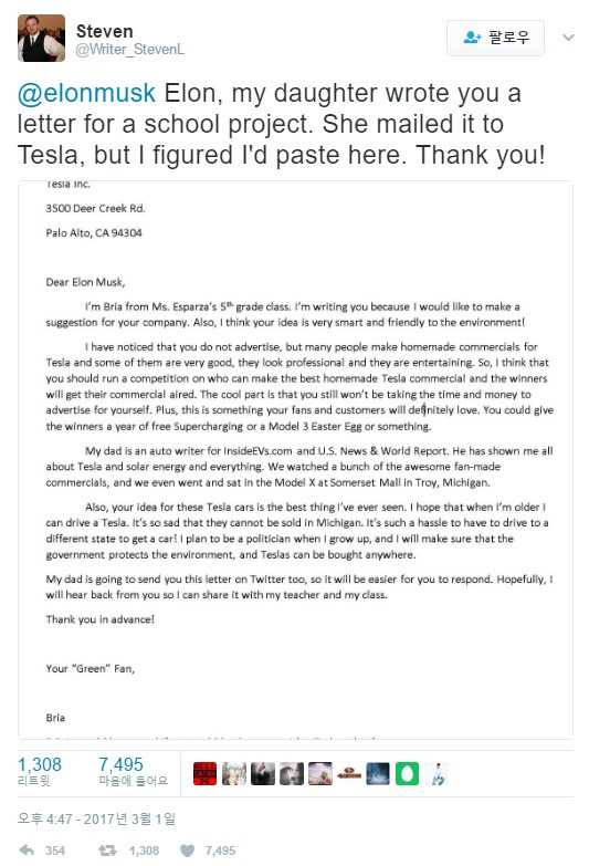 또 다른 예는 최근 가장 큰 팬덤을 보유한 브랜드, 테슬라이다. 테슬라는 미디어 광고를 하지 않는다. 이에 답답했던(?) 팬들은 직접 테슬라 광고 영상을 만들어 유튜브에 올렸다. 10대 소녀이자 테슬라 팬 '브라이어 러브데이'의 아버지는 딸이 테슬라 CEO인 일론 머스크에게 쓴 편지를 보고 일론 머스크에게 그 내용을 멘션 했다. '테슬라 고객들이 좋은 홍보 영상을 직접 만들고 있으니, 경연을 개최해 우승작을 수상하고 그것을 광고하면 좋을 것'이라는 내용이고, 이에 일론 머스크는 '프로젝트 러브데이'를 진행하며 답했다. 테슬라의 팬덤이 어마어마하기에 가능한 일이었다. 실제로 최근 10대의 드림카는 람보르기니, 페라리가 아닌 테슬라가 되어가고 있다.