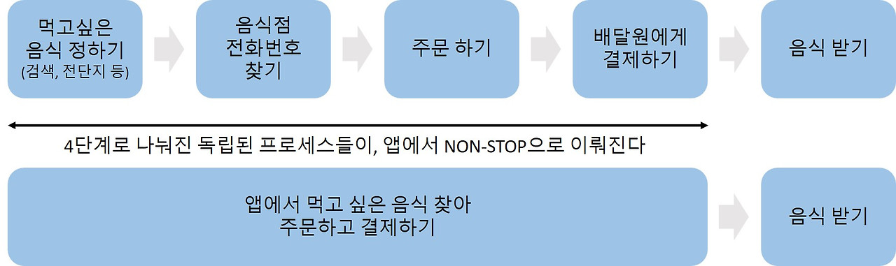 과거에는 (1) 먹고 싶은 음식을 정하고 -> (2) 전화번호를 찾아 -> (3) 전화해서 주문하고 -> (4) 배달원에게 결제하고 -> (5) 음식을 받는 프로세스로 주문을 했다.