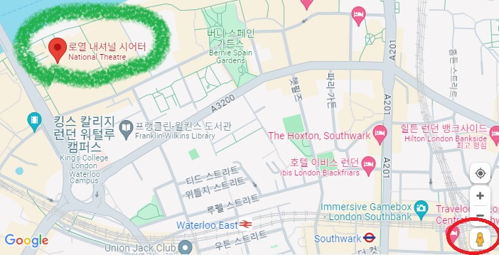 아래와 같은 식이다. 만일 내가 '로열 내셔널 시어터' 주변 분위기가 궁금하다면, 지도 오른쪽 하단에 있는 사람모양의 아이콘을 끌어다가(drag), 내가 보고 싶어 하는 지점에 데려다 놓으면 된다. 그럼 그 주변을 촬영한 사진들이 나온다. 이 사진들은 당장 어제나 이틀 전에 촬영한 사진들은 아닐 수 있지만 비교적 최근 사진들이기에 유용하게 활용할 수 있었다.