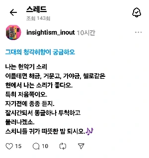 어젯밤 자기 전에 올린 글이다. 곧 나는 몇 가지 추천을 받았다. 비파, 콘트라 뭐시기, 아쟁, 바순, 호른..