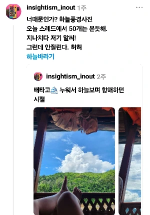 초창기에는 구름이 가까이 있는 독특한 하늘 사진 (30개국 여행하며 하늘을 자주 봤어. 서울에선 구름이 꽤 멀리 있거든.) 고정글로 해뒀더니, 하루에 하늘과 구름 사진만 20개씩 봤던 것 같다.