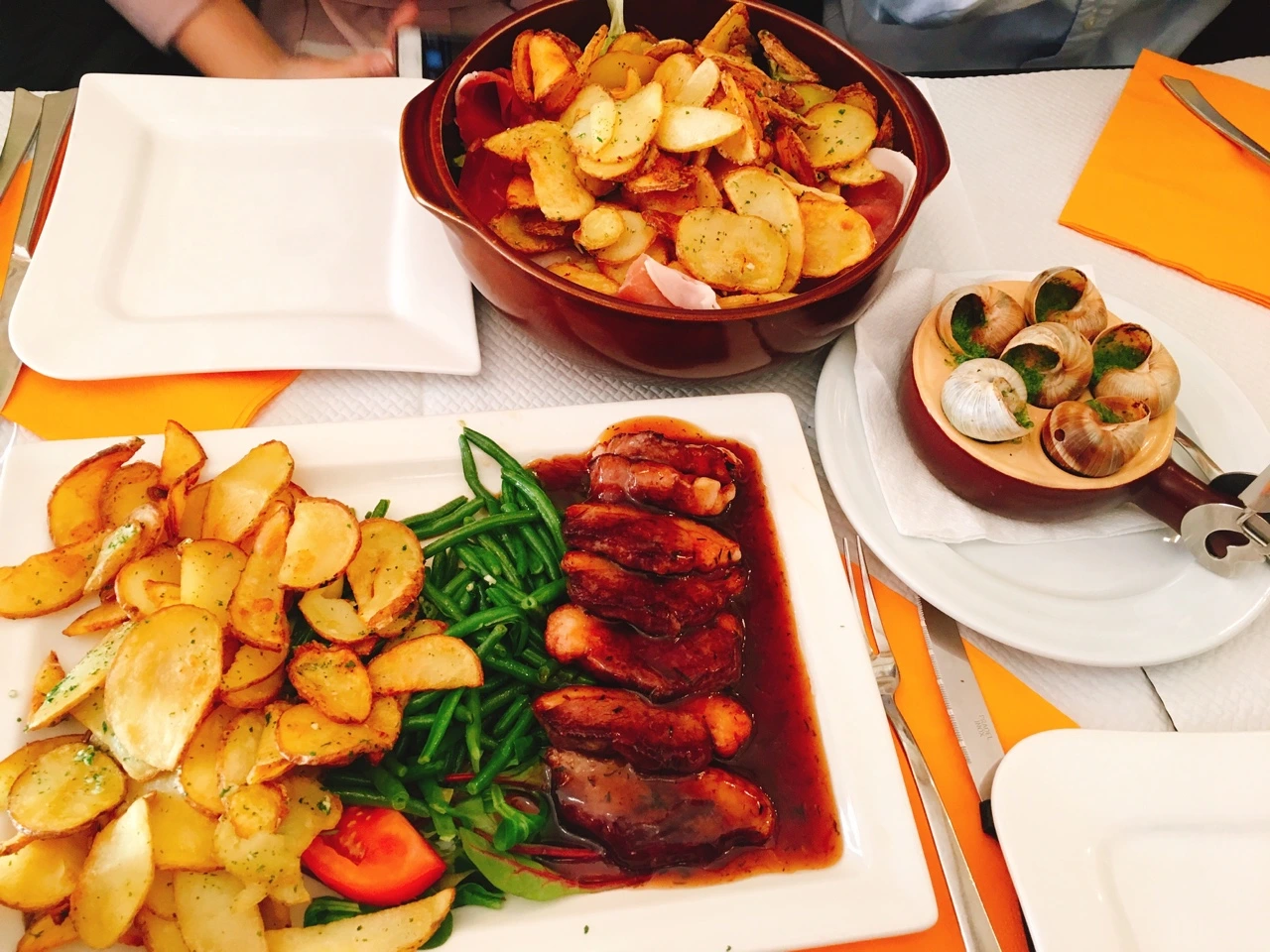 워낙 빠른 결정과 급작스러웠던 퇴사로 인해 세세한 여행 계획을 짜지 못했기에 선택한 파리의 한인 민박은 좋은 시작이 되었고, 내가 아닌 다른 여행객들에 의해 좋은 식당까지도 갈 수 있었다. 기억에 남는 파리에서의 레스토랑은, 사랑해 벽 근처에 있던 달팽이요리 식당이었다. 물론 이 곳 역시 내가 찾은 곳은 아니었다. 심한 감기 기운에 오전 내 숙소에서 쉬다가 사랑해 벽과 몽마르뜨 언덕을 보기 위해 나선 나는 함께 구경을 하기로 한 친구들과 조금 늦은 점심으로 달팽이 요리를 먹어보기로 했다. 프랑스 음식이라 하면 단연 달팽이 요리를 떠올리지만 내가 정말로 달팽이 요리를 먹을 거라고는 상상도 못했다. 아마 혼자 식당을 갔더라면 먹지 않았을 것이다. 외형이 이상하게 생긴 음식은 먹기도 전에 진저리 치던 나였기에 한국에서도 골뱅이와 같은 음식은 입에 대지도 않았기 때문이었다. 다행히 세 명이라서 각기 다른 음식을 세 개 시켰고 그 중 달팽이 요리가 있었다. 이곳에서는 에스카르고라고 불렸다. 다른 사람들과 함께 식당에서 식사를 하면 좋은 점이 바로 이것이었다. 혼자만의 여행은 어떤 것에 구애도 받지 않는다는 점에서 좋았지만, 식사를 할 때만큼은 꼭 누군가와 함께인 것이 장점이 되었다. 우리가 시킨 음식은 6마리의 달팽이, 데리야끼 소스가 일품이었던 오리 스테이크, 그리고 감히 상상도 못했던 푸아그라 샐러드였다. 예상은 했지만 역시나 비주얼에 충격을 먹은 나는 한 마리의 달팽이도 먹지 않으려 했다. 그러나 여기까지 왔는데 안 먹어보면 후회할 거라며 손수 달팽이를 꺼내 먹여준 한 귀여운 친구 때문에 딱, 한 마리를 먹었다. 물론, 나의 예상은 틀리지 않았다. 이건 아무리 사랑하는 사람이 먹여주더라도 먹기 어려운 모양새와 맛이었다. 그저 엄청난 결심 끝에 온 곳에서의 대단한 음식 중 하나로 기억하기로 했다.