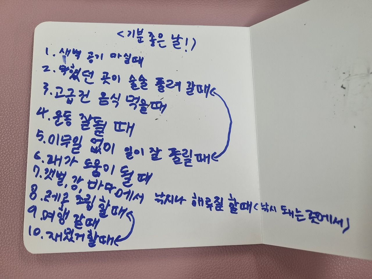 각자 행복한 순간을 10가지 이상 써보라고 했는데