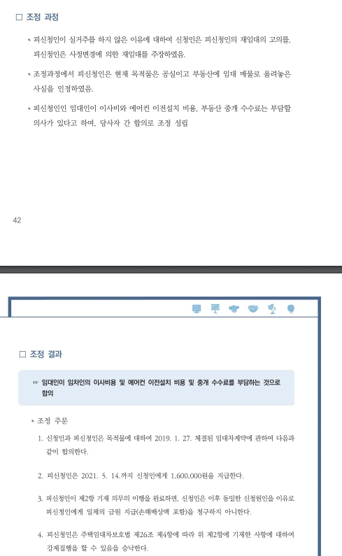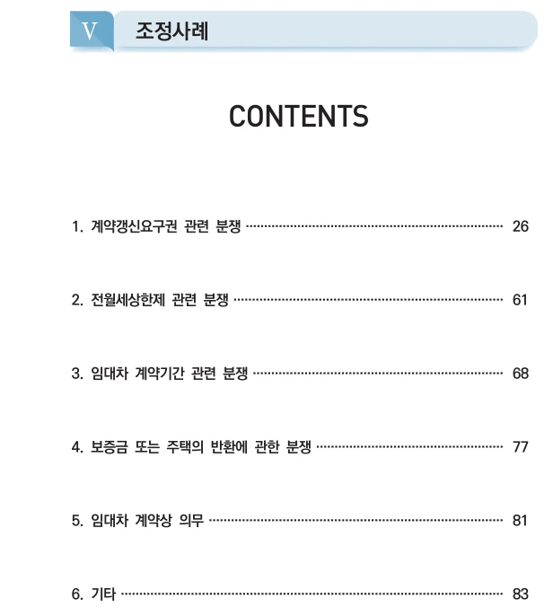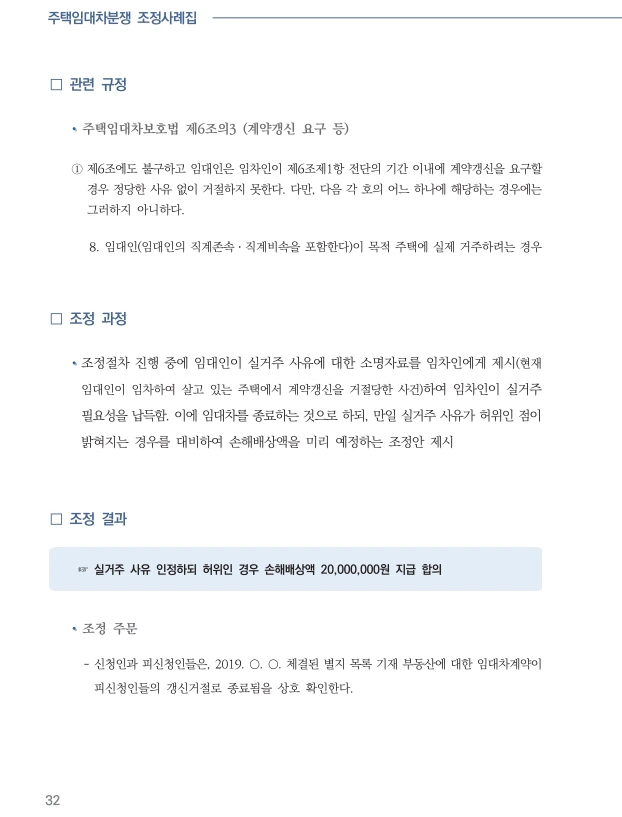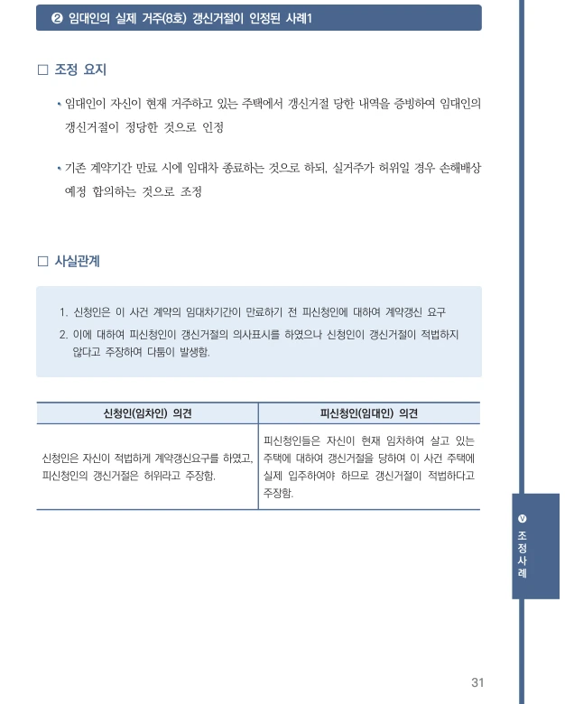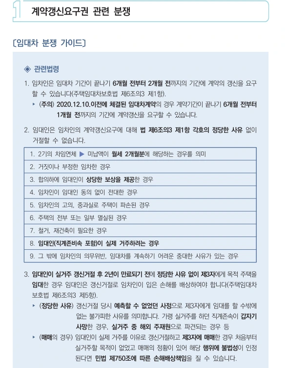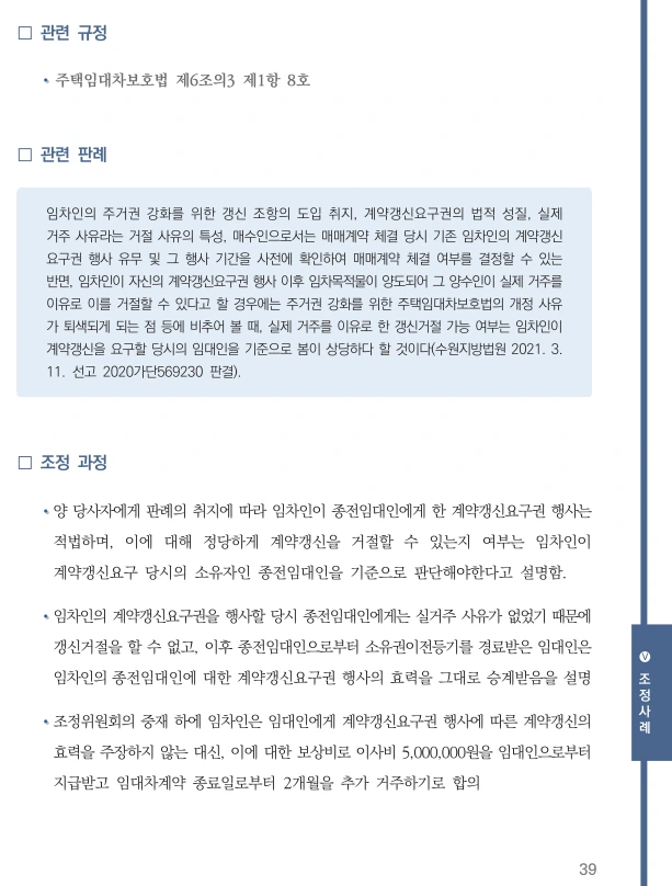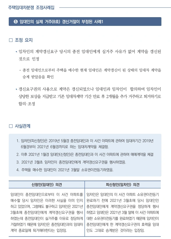 21년 12월 주택임대자 조정사례집이 발간되었다. 임대차 3법 시행이후 계약갱신청구권과 관련된 다툼이 많았다. 이것에 관련된 사례들이 제시되어 있기에 유용한 자료료 활용될 것이라 http://www.molit.go.kr/USR/policyData/m_34681/dtl.jsp?search=&srch_dept_nm=&srch_dept_id=&srch_usr_nm=&srch_usr_titl=Y&srch_usr_ctnt=&search_regdate_s=&search_regdate_e=&psize=10&s_category=p_sec_2&p_category=&lcmspage=1&id=4599 (PDF 파일링크)