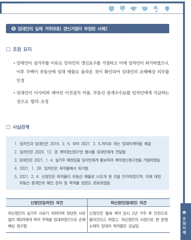 뜨거운 감자인 임대차 3법에 대한 조정사례들이 제시되어 있다. 그중에서도 가장 말이 많은 계약갱신청구권에 대한 사례가 세간의 이목을 집중 시키고 있다. * 케이스 1(계약갱신 인정된 사례: 본인 실거주)