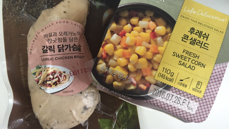 월요일, 어제 저녁 주문한 식량을 택배기사로부터 받아순간, 이미 일주일간 식이조절에 성공한것처럼 뿌듯하다. 때마침 점심이어서 신중하게 고른 갈릭닭가슴살과 후레쉬 콘샐러드를 먹었다.