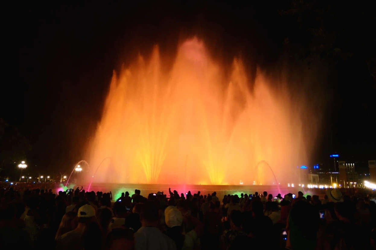 우리가 도착한건 9시쯤이었고, 주변 한국 사람들의 이야기를 주서 들으니 9시 30분에 시작해서 1시간 동안 한다고 했다. 분수쇼를 한시간이나 하는건가..어떻게....하는 생각으로 기다린다. 9시 30분이 되니 계단 사이 작은 분수들이 작동된다. 그 사이에 앉아있던 사람들이 놀라서 소리를 지른다. 그리고 곧 메인 분수에 물이 올라온다. 1단, 2단, 3단 물이 올라오고 음악이 들리더니 분수쇼가 시작한다. 분무기처럼 잔뜩 물을 흩뿌리더니 환상적인 조명이 물을 따라 번지면서 몽환적으로 분위기가 연출된다. 두바이의 화려하고 역동적인 분수를 생각했는데, 이것은 독특하고 다르다. 이름이 매직 분수라고 했는데 이름에 딱 걸맞다.