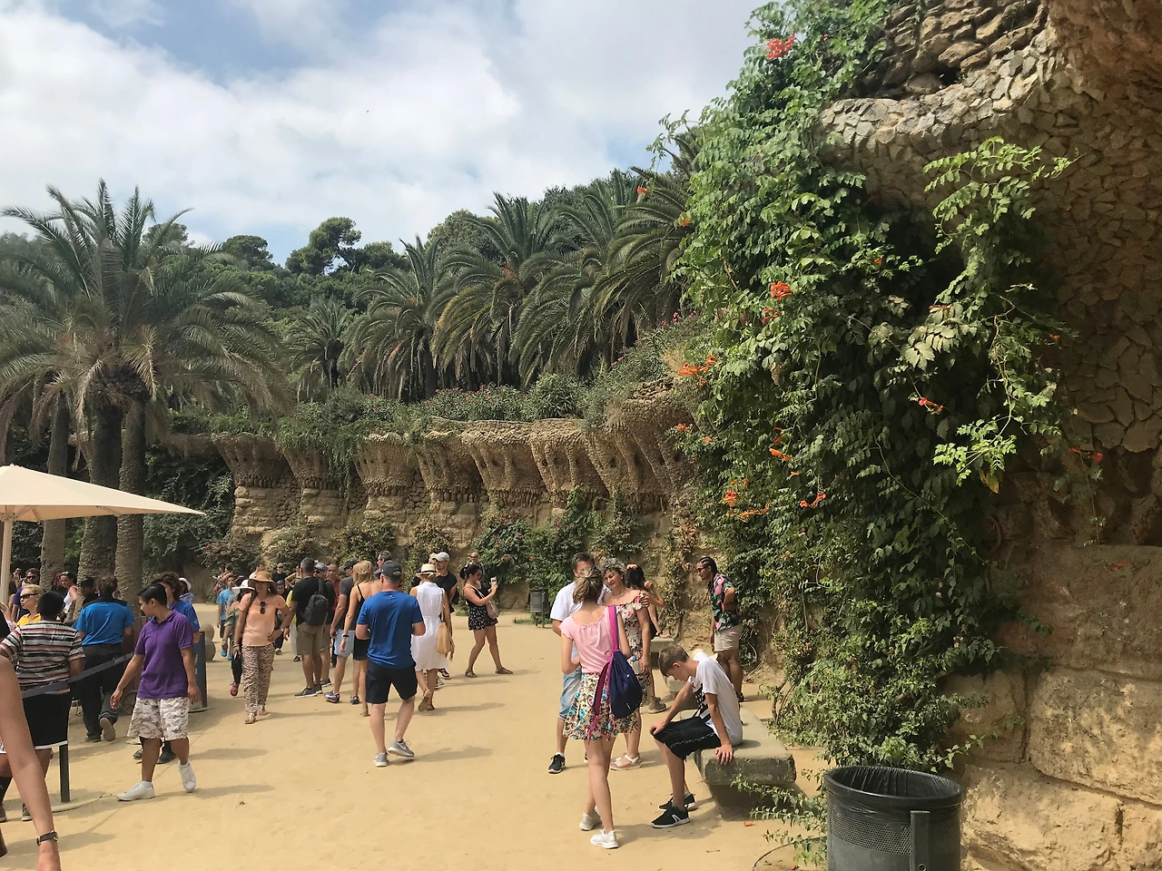입장하는 길, 구경을 해야겠다는 설레임보다 어딘가 앉아서 쉬고 싶다는 생각이 모두가 간절하다. 입구 옆 지하 동굴처럼(?) 보이는 곳에 사람들이 다들 주저 앉아 쉬고 있었다. 우리도 자연스럽게 뜨거운 태양을 피해 그늘 속으로 숨는다. 자리에 털썩 주저 앉아 잠시 부채질을 하면서 몸의 온도를 낮췄다. 제시는 주저 앉자마자 리타이어를 선언한다. 하지만 구엘이잖아. 더 쉬고 싶었지만 어느 개념없는 분이 그 굴속에서 담배를 야무지게 펴대는 바람에 더 쉴 수 없어 밖으로 나왔다. 그 유명한 도마뱀 상 근처에 역시나 사람들이 엄청 많았지만 금새 자리 잡고 기념사진을 돌아가며 찍은 다음 계단을 올라가니 그게 다인가싶고 위로 올라가서 전경을 바라보는데 아름답긴 한데 지친데다가 날이 쪄대니 장사가 없다. 결국 우리는 사진 몇장을 찍고 돌아나왔다.