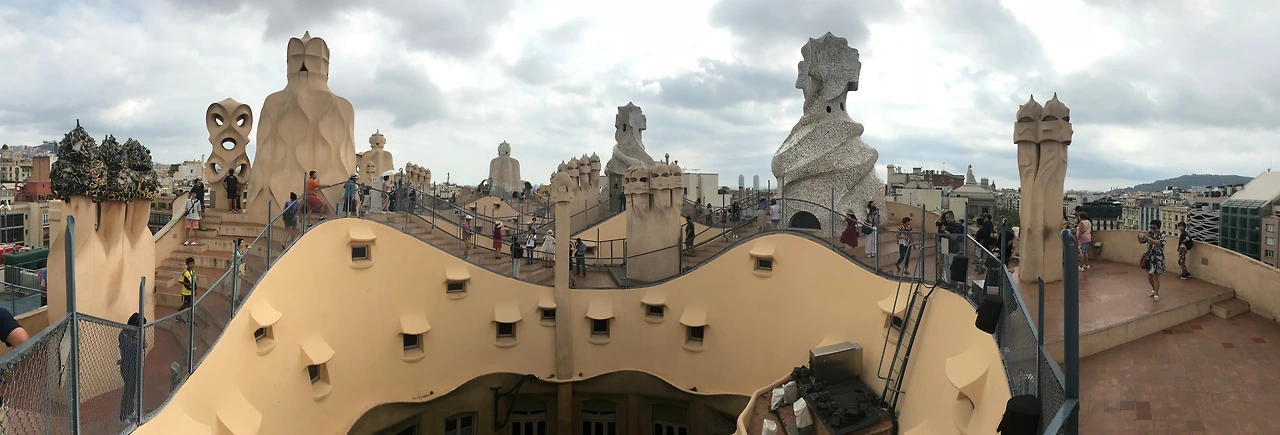 그리고 밖으로 이어진 옥상은 카파도키아를 연상시켰다. 중간에 서 있는 헬멧모양의 굴뚝들이 인상깊었는데 스타워즈의 구르프들이 바로 이 건축물에서 영감을 받았다고 한다. 삼각대 역할도 하는 셀카봉을 세어두고 단체 사진을 찍었는데 셀카봉을 쓸 순 있지만 그렇게 사진을 찍으면 안된다고 혼났는데. 셀카봉이 안된다는 이야기는 들었어도 이런건 처음이다. 구석구석 많은 사람들이 구경하고 있어서 사진을 찍기가 쉽지 않았다. 게다가 날씨가 흐릿해서 아쉬웠다. 그래서 더욱 흐렸었던 카파도키아가 생각났던건가?