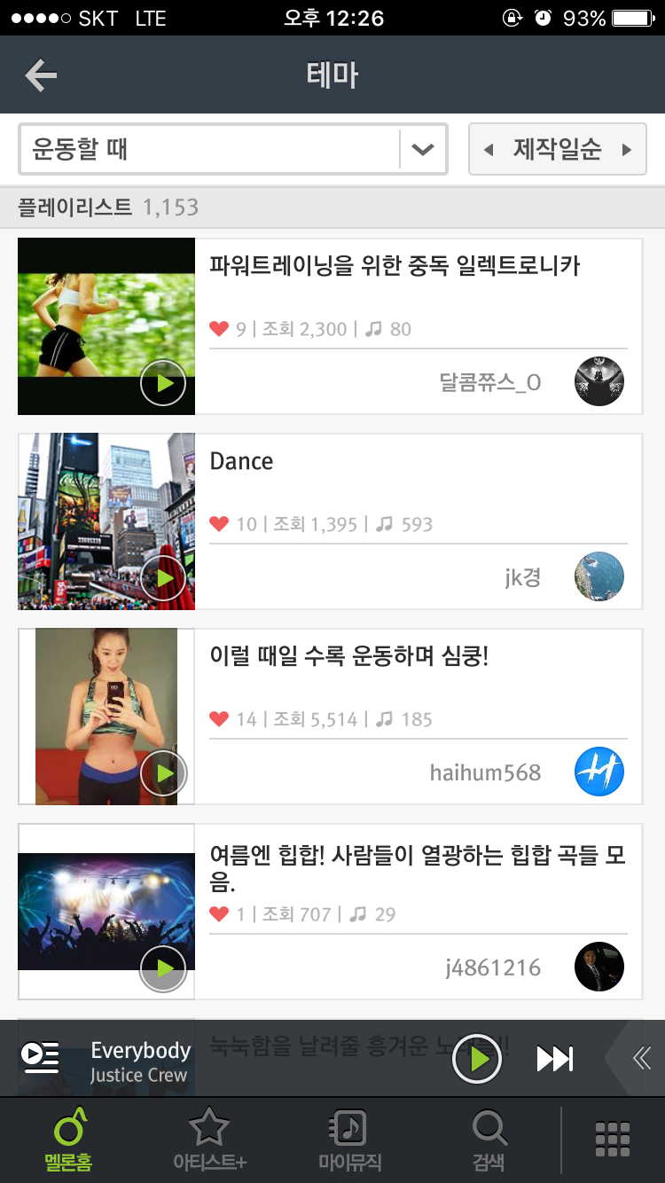신나는 음악을 들으면 어깨가 들썩이는 흥부자지만, 노래는 잘모르므로 멜론DJ를 아주 잘 이용하고 있다. 테마장르에서 운동할때를 선택하면 훌륭하신분들이 노래리스트를 아주 잘 구성해놓으셨다.