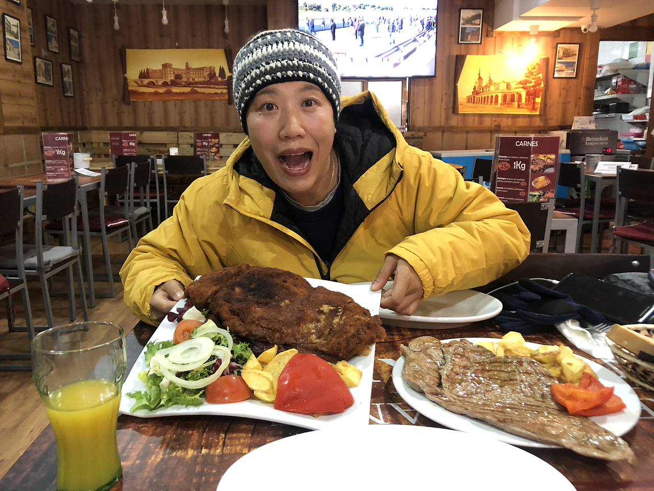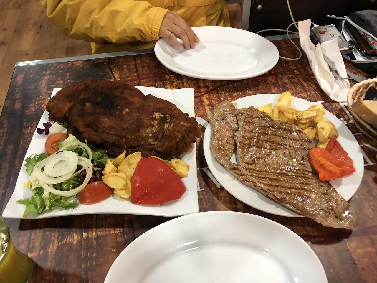 하나는 얇은 스테이크 였고 하나는 얇은 소고기와 치즈를 같이 튀긴 돈까스였다. 고기를 먹는데 와인이 빠지면 안되니 와인 한잔을 시켰는데 한병이 나왔다. 뭐, 마셔버리지 하는 마음으로 기쁜 마음(?)으로 받아드렸다. 30분에 가벼운 커피한잔이 예정이었던 우리는 결국 2시간동안 고기와 와인을 먹고 마셨다. 순례자 아니고 술례자...