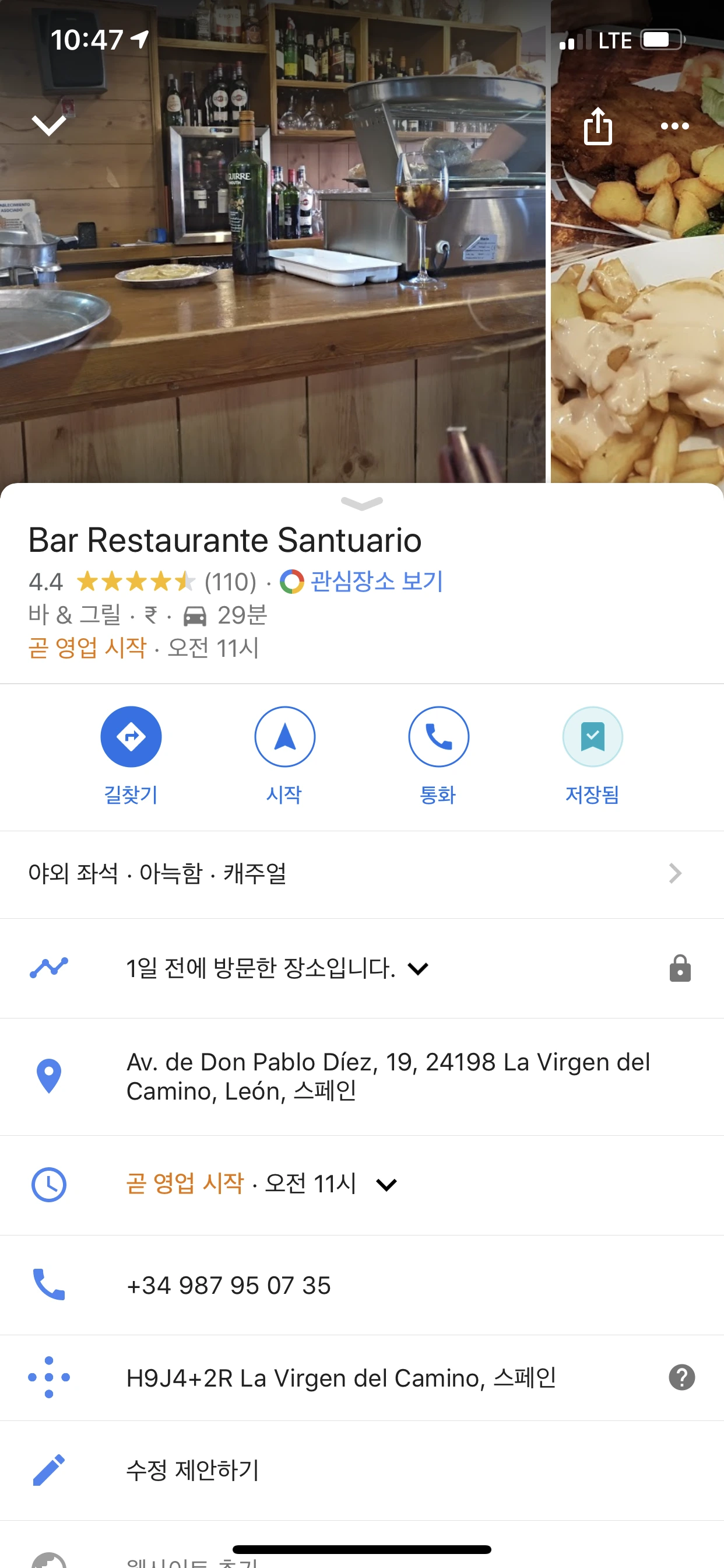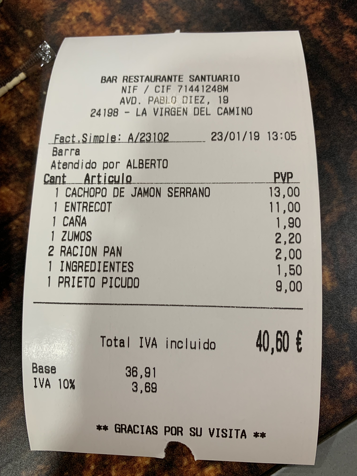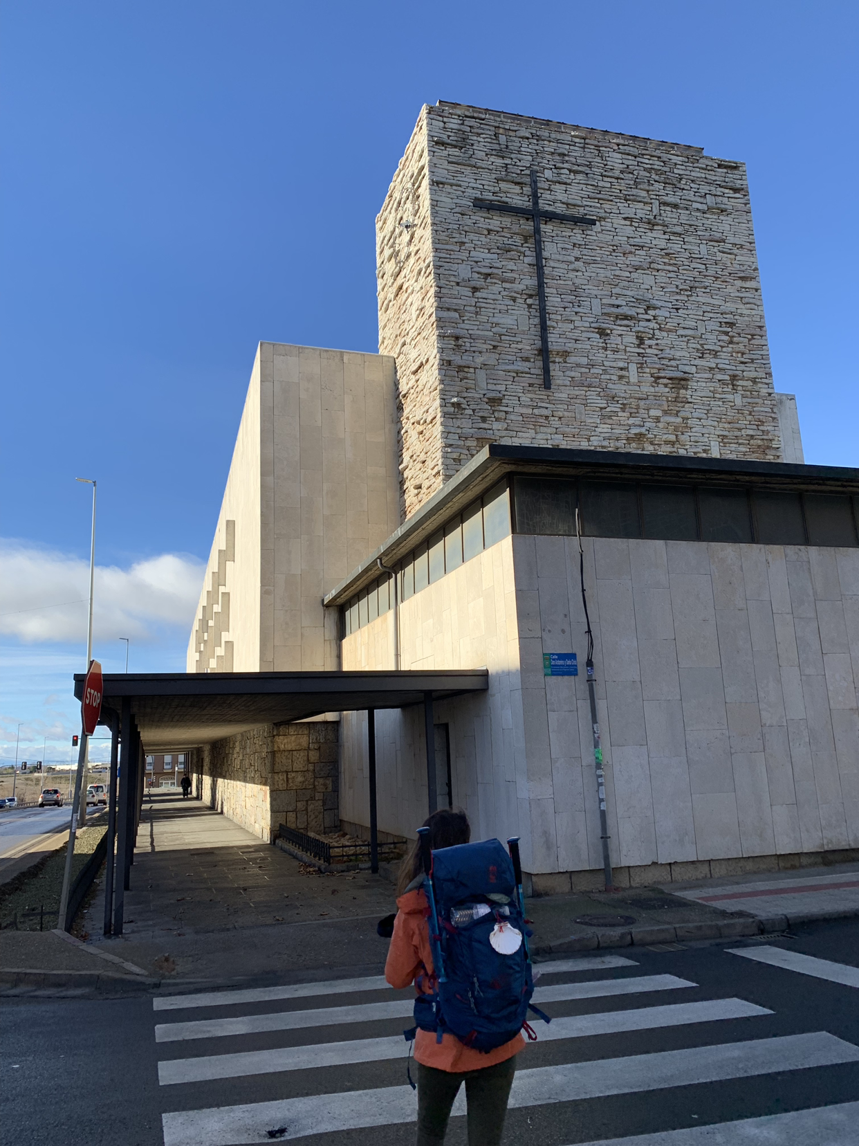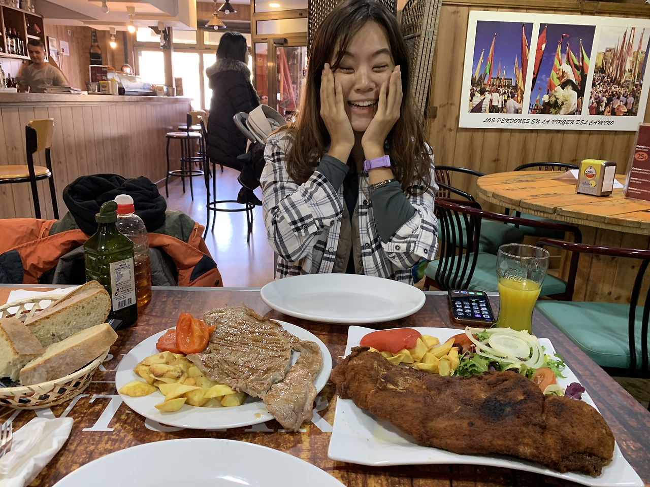 춥다고 했는데 온도는 영상 9도, 등에 서서히 땀이 차기 시작했다. 7km를 넘게 걸었으니 도장을 받고 잠시 카페에서 딱 30분만 쉬기로 했다. 길을 걸으며 식당을 스쳐지나가는데 이른 시간인데도 배가 슬슬 고픈것 같았다. 우선 대성당에 들렀는데! 문이며 교회장식이 무척 그로테스크 한것이 매우 근사했다. 문을 조심스럽게 들어가니 하얀색 옷을 입은 신부님이 계셨다. 손으로 도장찍는 흉내를 내니 들어오라고 한다. 신부님이 뭐라고 하는데 나는 알아들을 수 없어서 헿헿과 그라시아스만 반복했고 에이미는 스몰토크의 강자답게 그 와중에 대화를 이어갔다. 나중에 물어보니 날씨 이야기였다고 했다. 도장을 받고 나와 조금 전 검색해둔 레스토랑으로 기쁜 발걸음으로 이동했다.