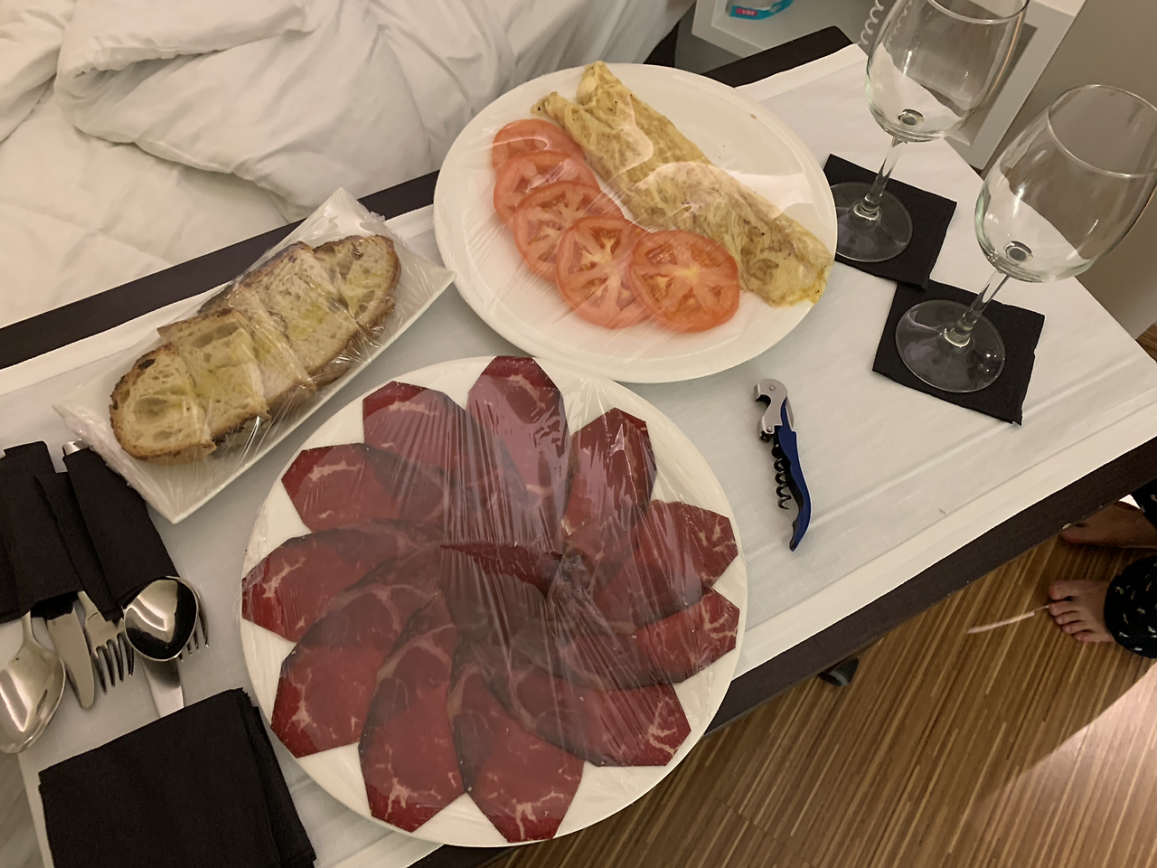 이미 완전한 밤이 되어서야 우리는 도착했다. 환호할 힘도 없이 호텔로 들어서자마자 깔끔하고 정돈된 인테리어가 눈에 들어온다. 키를 받고 순례자 여권에 도장을 받고 방으로 올라가서 우리는 누가 먼저랄것도 없이 오늘 이곳에서 호텔을 잡은 것은 최고의 선택이라고 했다. 뜨거운 물줄기로 샤워를 하고나니 온몸이 비명을 지른다. 바닥에 발을 내딛을때마다 아픔이 몰려온다. 누가 발바닥을 마구 때린 것 같았다. 에이미는 특히 발바닥에 물집파티까지 열려 더 아팠다. 우리는 오늘 밤은 밖에 나갈 수 없겠다고 판단하고는 룸서비스로 음식 몇개와 와인 1병을 시켰다.