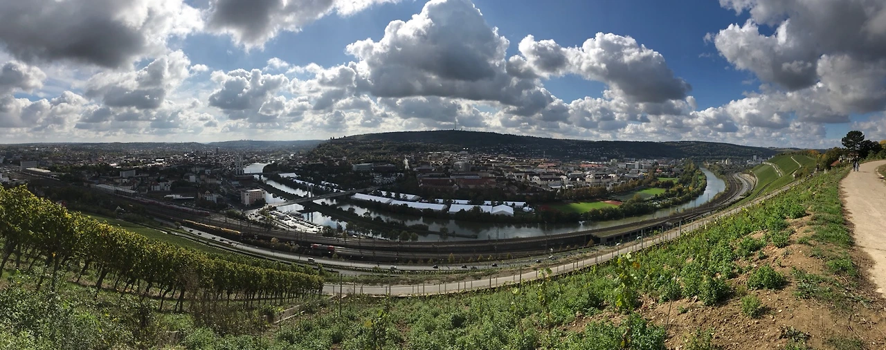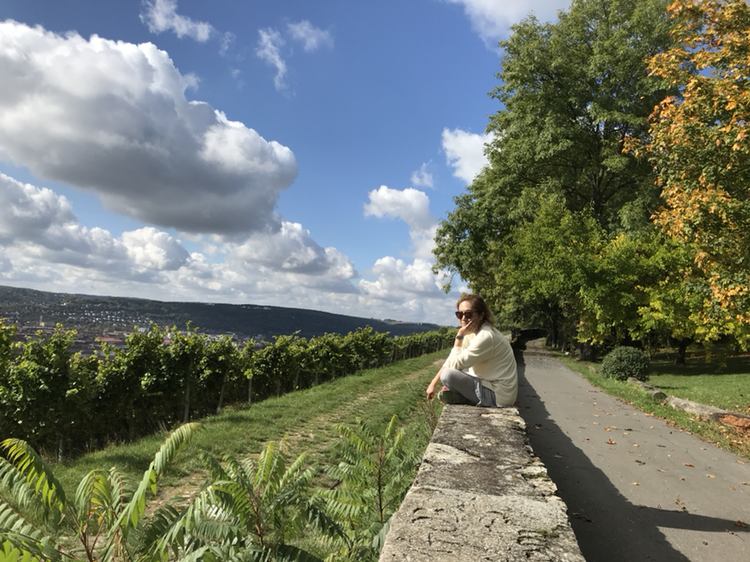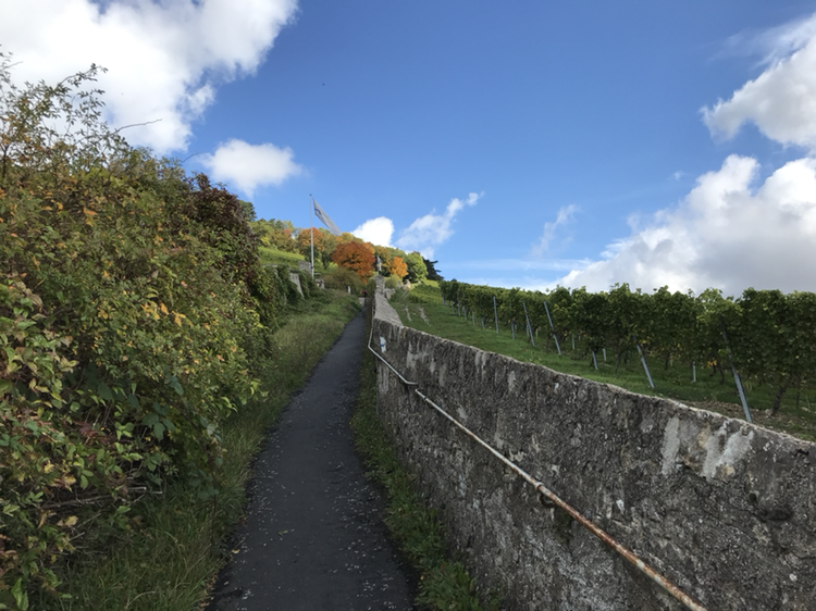 지금 향하는 곧은 포도밭 사이를 트래킹 하는 코스였다. 구글지도가 안내해주는 길을 따라 좁은 계단을 한창 올라가니 한눈에 도시가 들어온다. 트래킹 시작점에 있는 와인샵이 와쉽게도 휴무다. 한바퀴 돌아 와인을 한잔하고 내려올 계획은 아쉽게도 무산되었다. 비탈을 따라 올라가는 길이 더 있어서 올라갔다. 거친 숨을 내쉬고 헉헉대면서 올라가자 좀전보다 더 황홀한 풍경이 펼쳐져있다. 사방에는 포토밭이고, 눈 아래는 마인강을 따라 도시가 펼쳐져있다. 구글지도에는 더 올라가는 길은 없었는데 눈앞에 오르막 길이 보인다. 뭐 길이 아니면 내려오면 되니까 하는 생각으로 올라섰는데 또 다시 계단이 있었다. 끝까지 올라가보자 하는 마음에 단숨에 올라간다. 길 끝에 숲으로 이어지는 길이 있고 왼쪽으로 트래킹길이 펼쳐져있다. 포도밭옆 흙길과 닦여진 도로 사이 높은 담벼락이 있었는데 할아버지 한분이 걸터앉아 맥주를 들이키고 있었다.