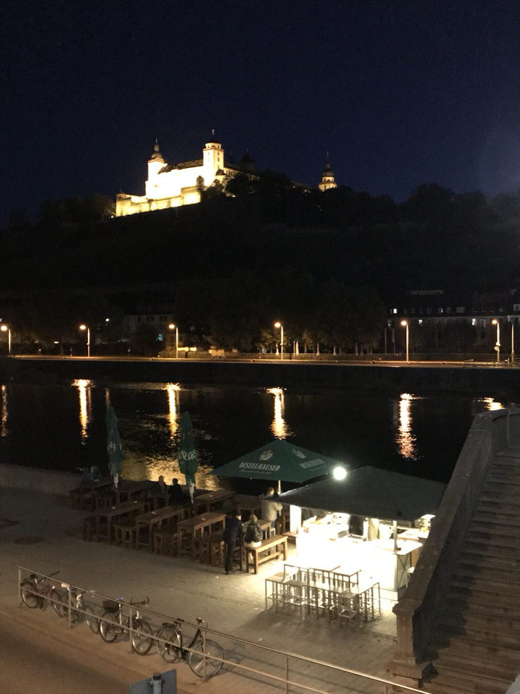 어짜피 밖은 실컷 구경했고 실내에서 글을 써야겠다고 생각하고 자리를 잡았다. 가득 채워준 와인을 마시면서 프랑크푸르트 여행기를 이어 쓰기 시작했다. 글을 쓰다 고개를 드니 옆 테이블의 할아버지가 어디서 왔냐 묻길래 한국에서 대답했다. 잠시 침묵이 이어지고, 나도 질문을 더 할까 어색한 미소를 서로 지은채 다시 아이패드로 시선을 돌렸다. 거의 마무리하고 시간을 보니 8시가 다가온다. 창밖으로 슬쩍 봤더니 이제 완전한 밤이 되었다. 창문 밖으로 아까 봤던 성이 빛나고 있었다.